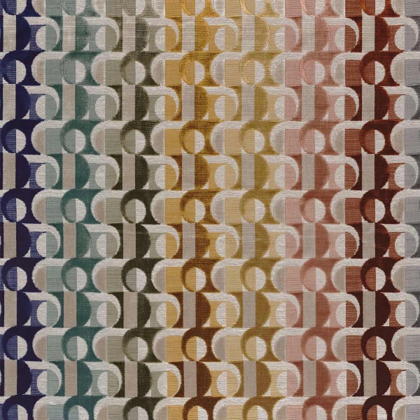 Le velours de viscose Abondance, conçu par Casamance, captive avec son motif jacquard riche en couleurs et texture. Il présente des cercles et des demi-cercles interrompus par d’autres figures géométriques. L’alternance des boucles coupées et non coupées crée un effet de relief, outre le jeu d’ombre et de lumière de leur reflet lumineux.