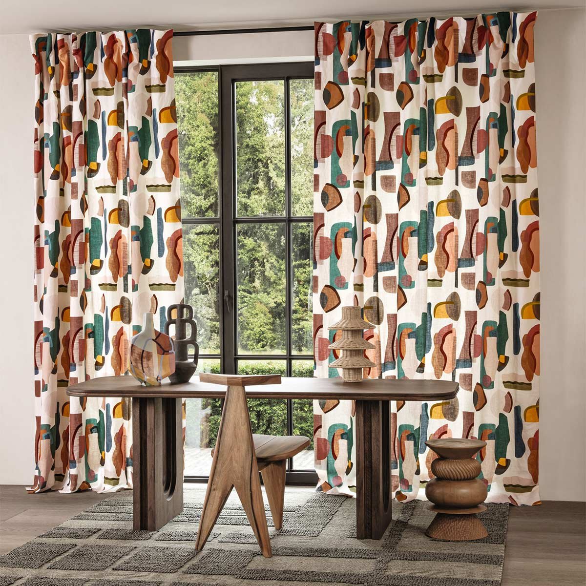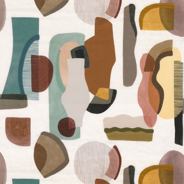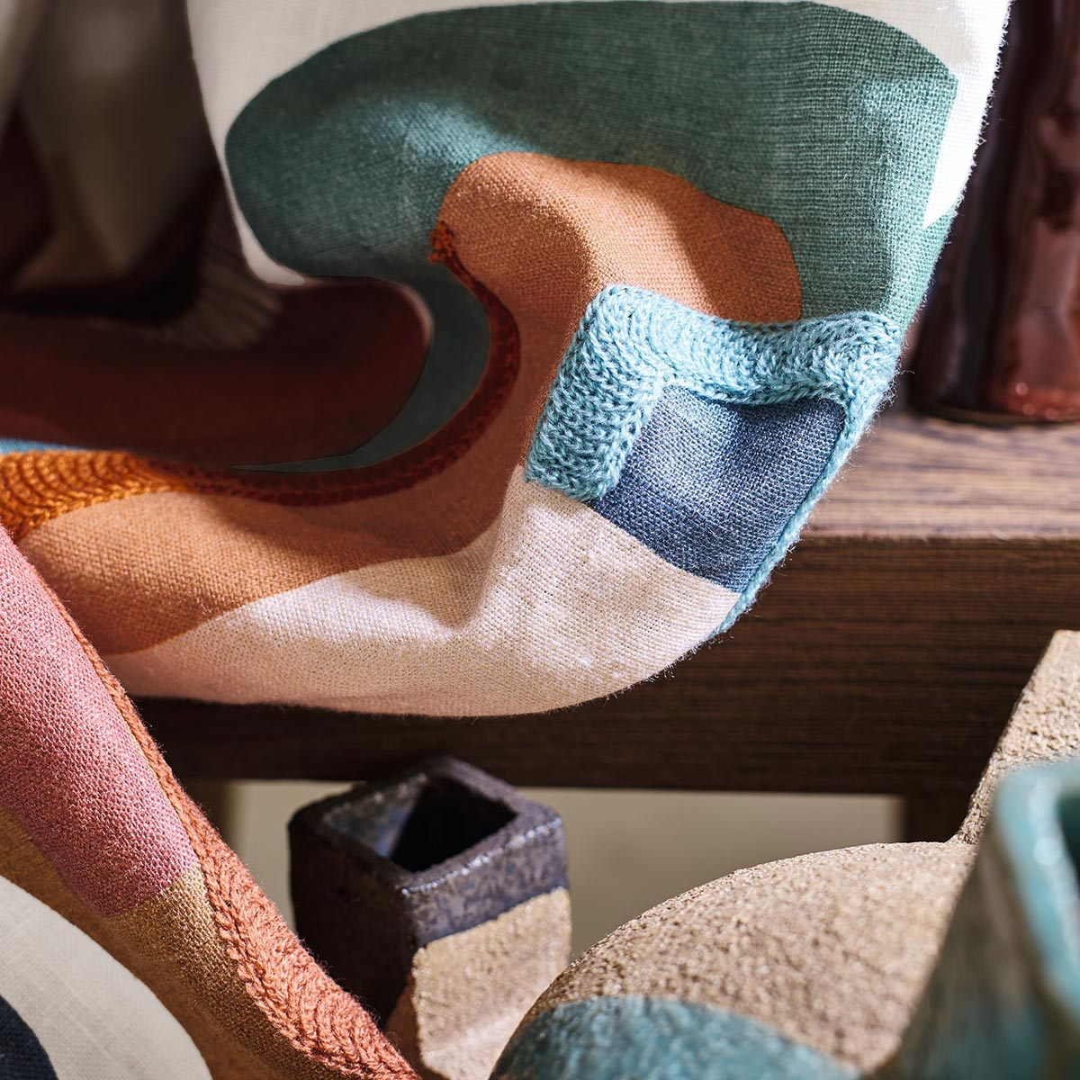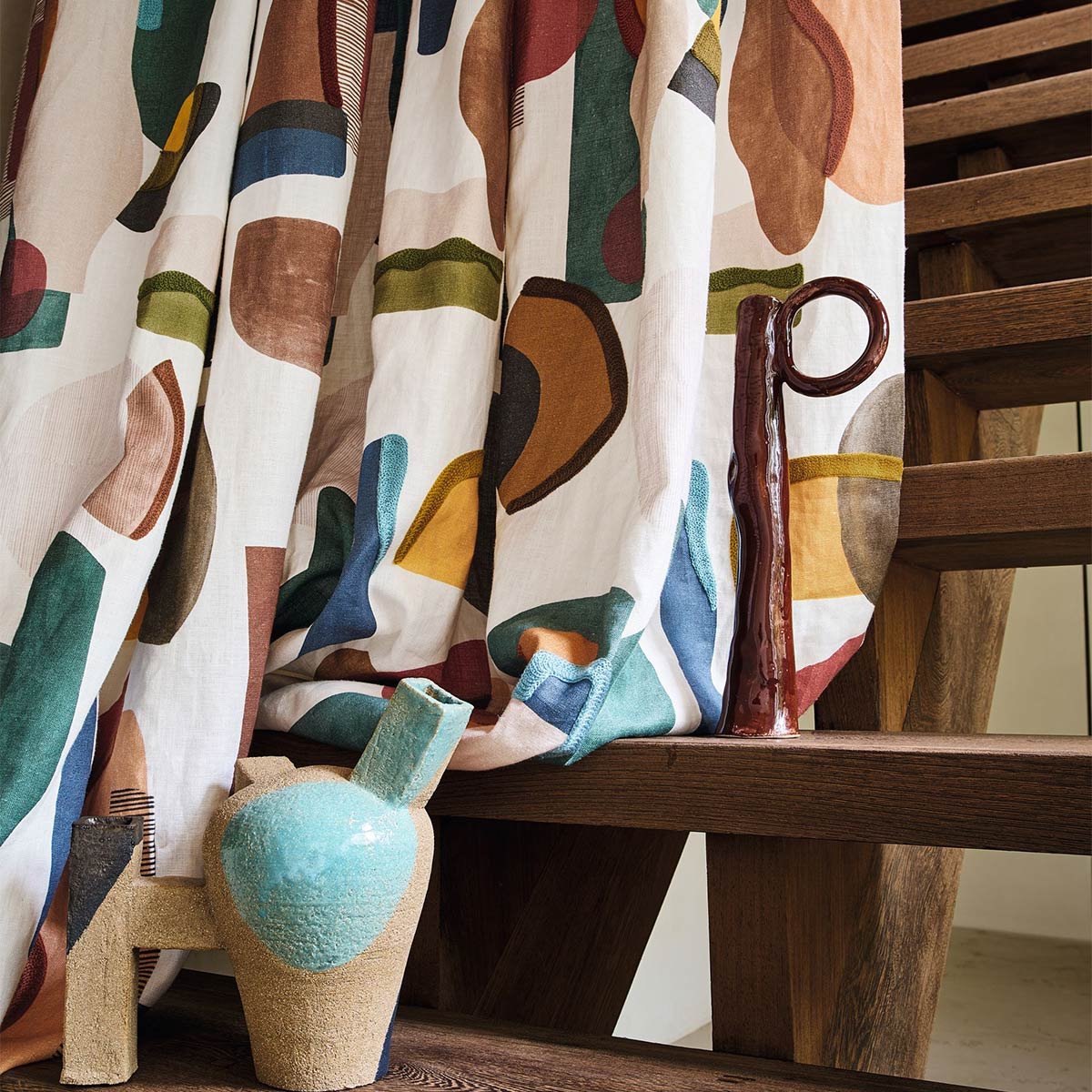 Machaya est un voile opaque multicolore conçu par Casamance. Il attire l’attention avec son graphisme contemporain, réalisé avec une double technique de savoir-faire textile. Le tissu arbore des figures organiques peintes à la main, avant d’être numérisées et imprimées sur du lin. Elles sont ensuite embossées par des points de chaînette, brodés avec de laineux fils d'acrylique qui enrichissent la texture.