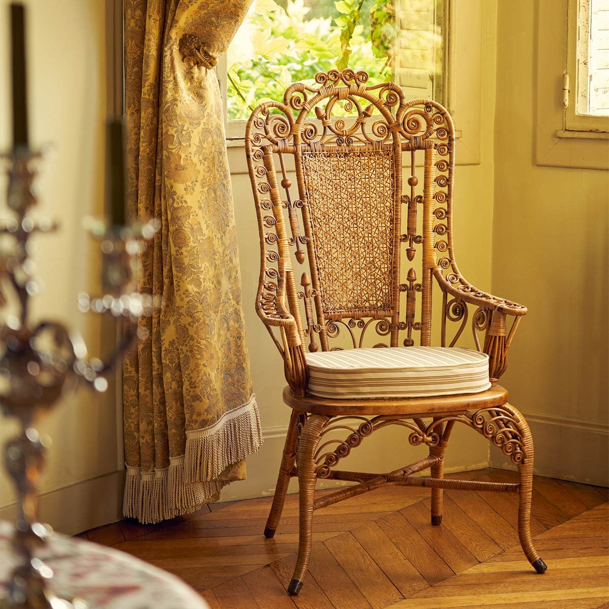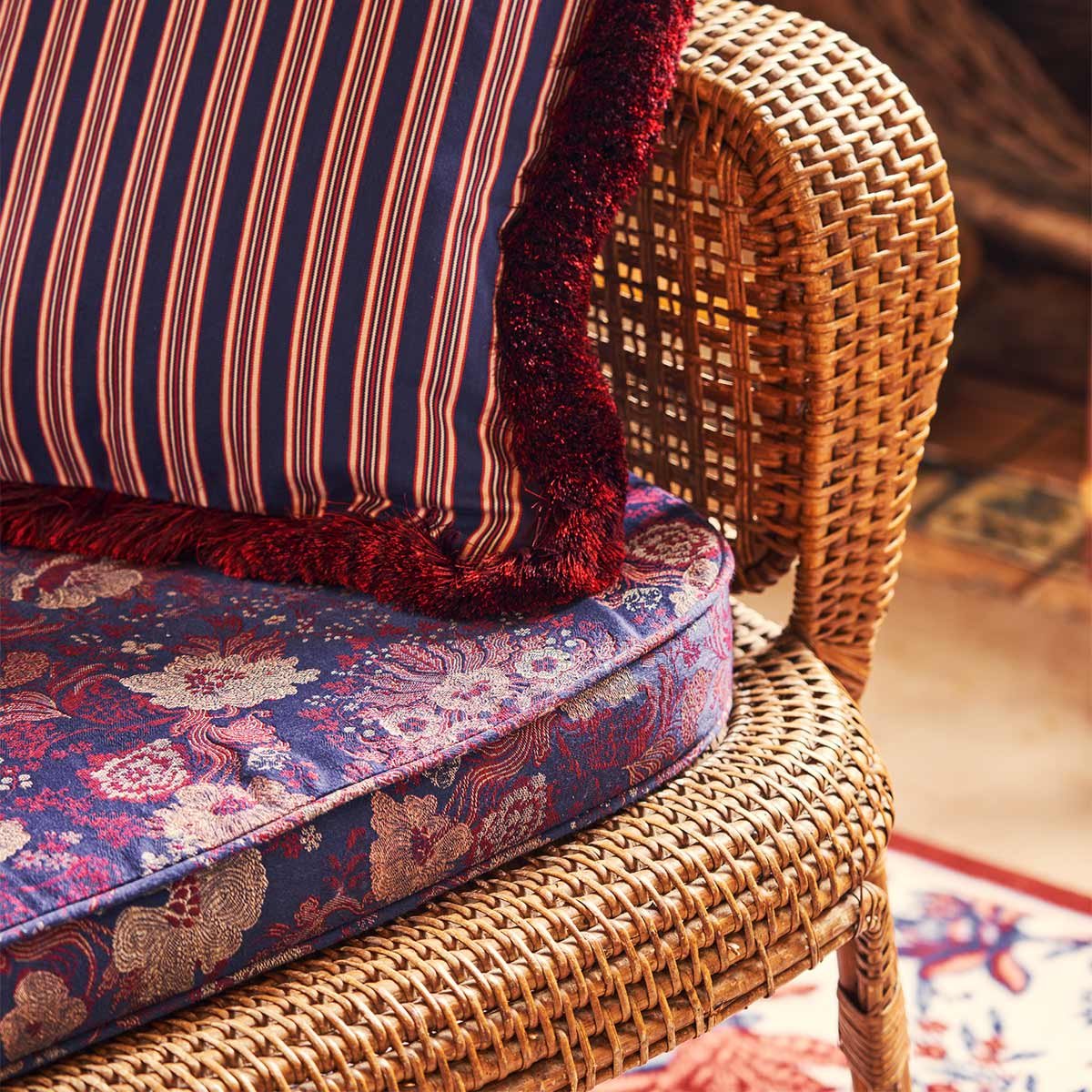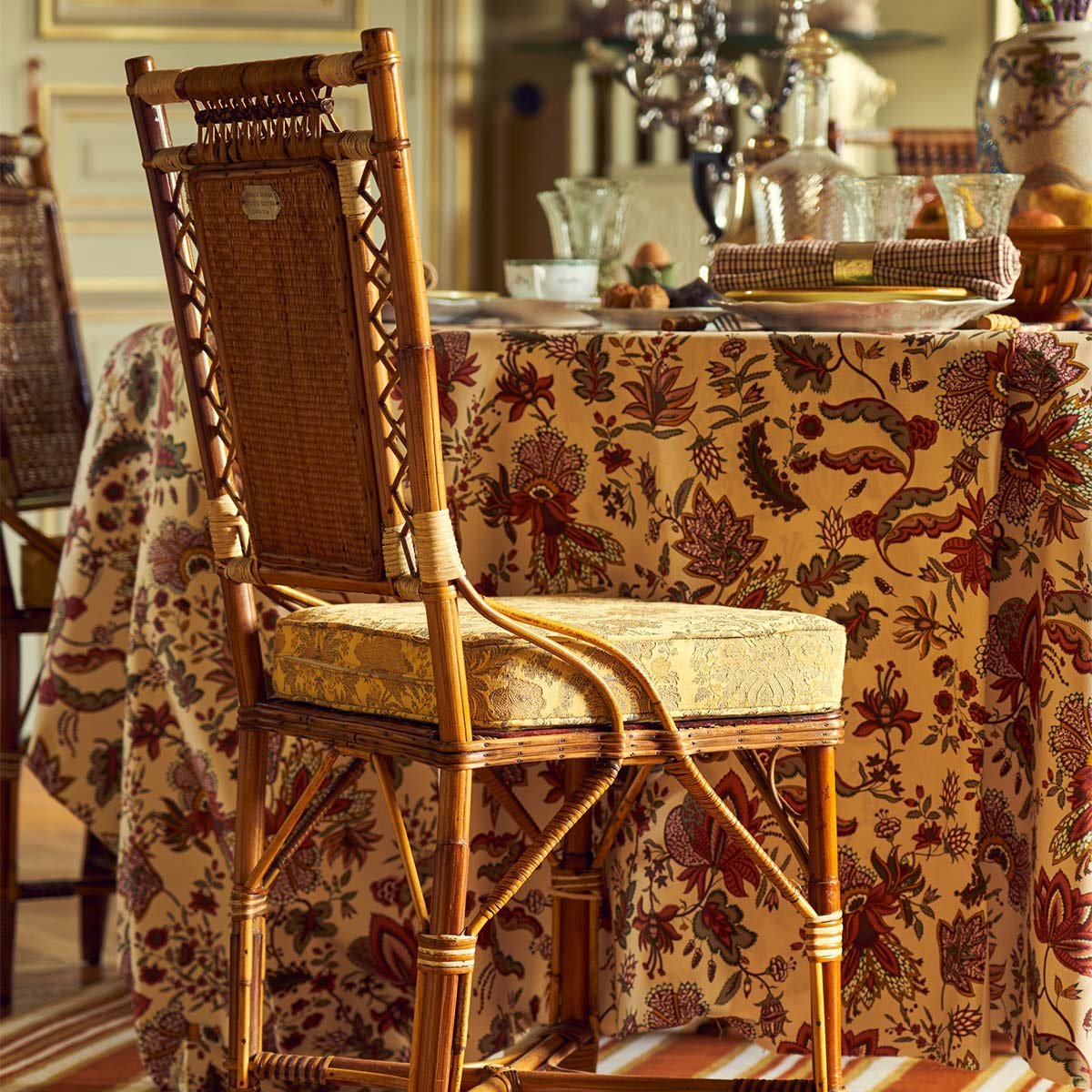 Le tissu Félicité de la maison Quenin se dresse tel un chef-d'œuvre textile, évoquant une symphonie florale. Chaque fil tissé incarne une poésie visuelle, un ballet délicat de bouquets opulents qui dansent sur un fond de nuances coordonnées. Rappelant les jardins secrets des contes de fées, ce jacquard mat est orné d’un effet brodé, mettant en valeur chaque trait de ce motif.