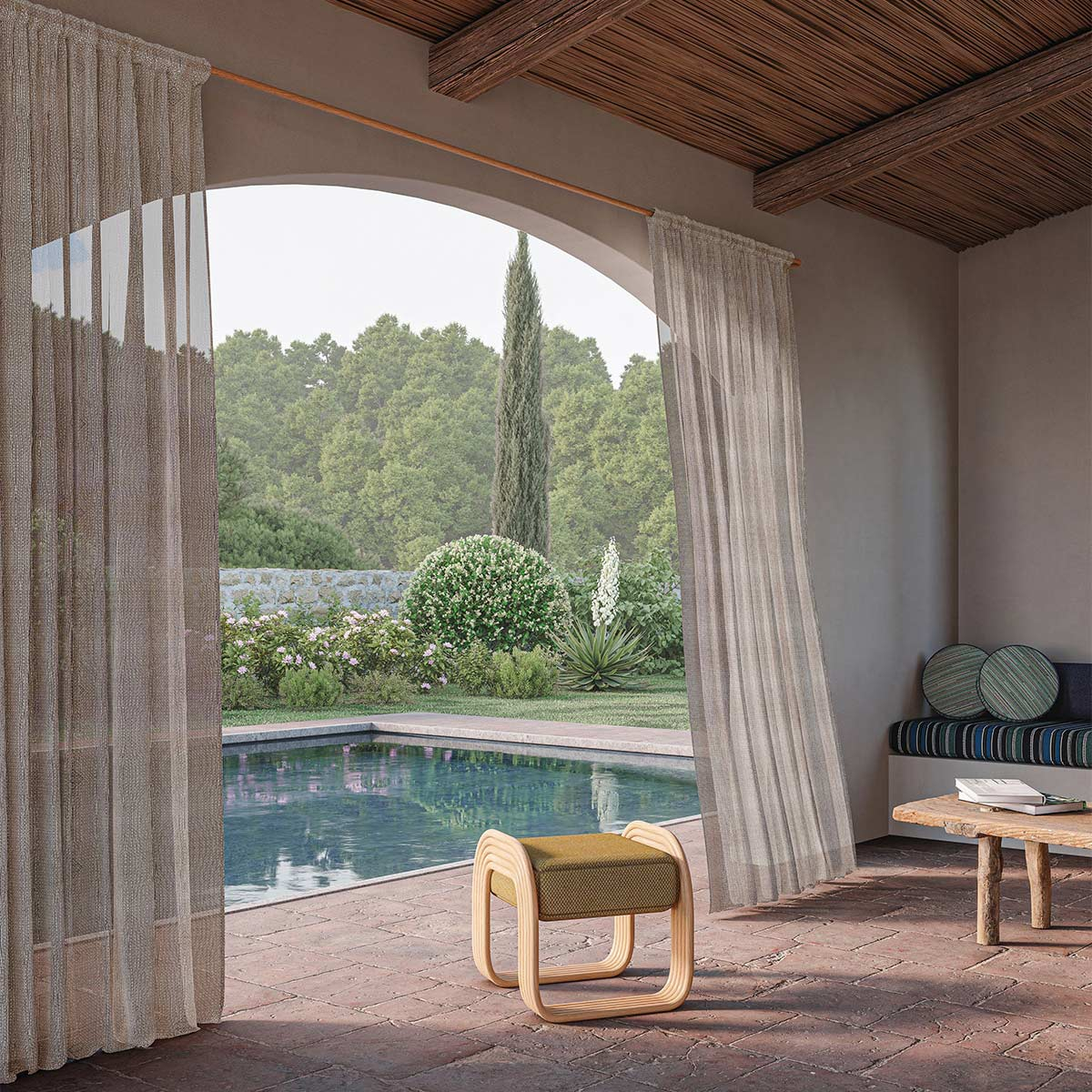 Ce tissu est spécifiquement conçu pour l'extérieur dans un matériau résistant aux intempéries et aux UV. Il peut également être utilisé en intérieur.