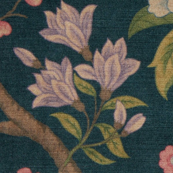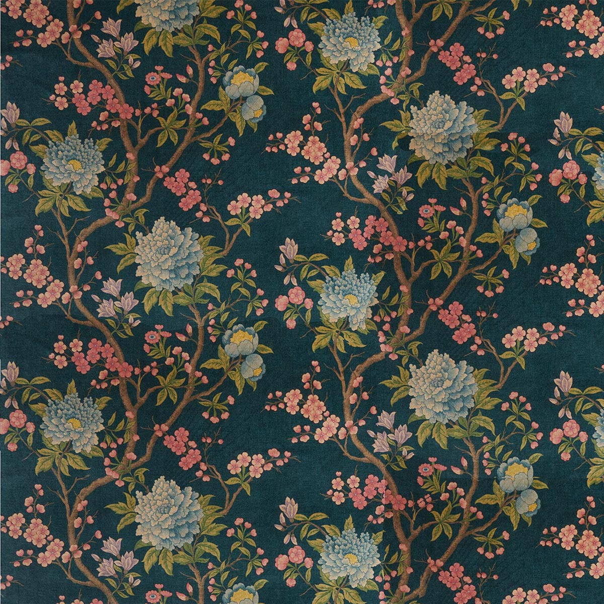 Inspiré de la chinoiserie, le velours Porcelain Trail présente des branches fleuries de chrysanthèmes et de cerisiers. Il reproduit un ancien motif, conçu vers la fin des années 1960 pour décorer un mobilier du local de Liberty. Les figures apparaissent ici agrandies, complètement rafraîchies avec de nouveaux coloris. Leur palette douce et lumineuse épouse le lustre du textile, dont l'éclat éveille les espaces.