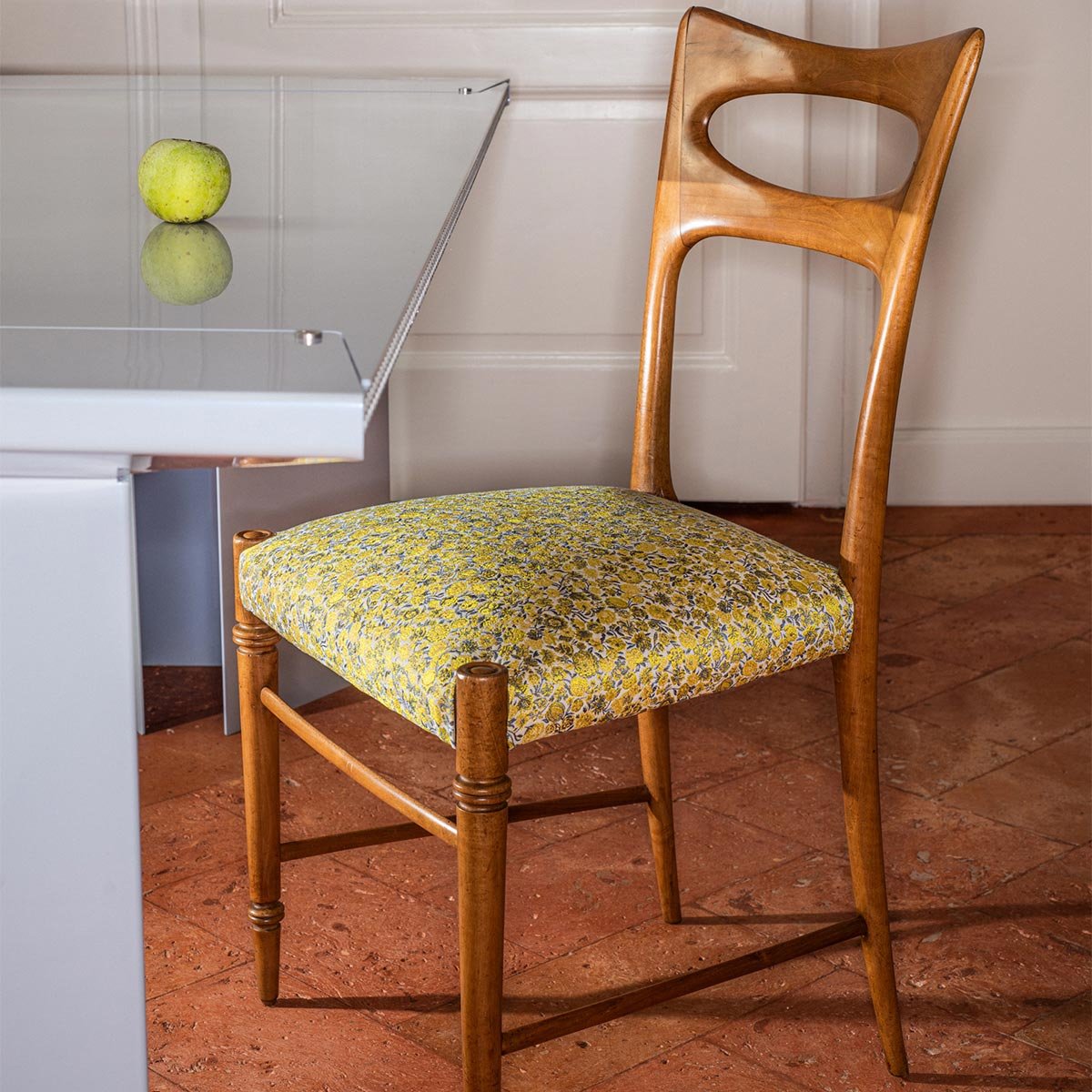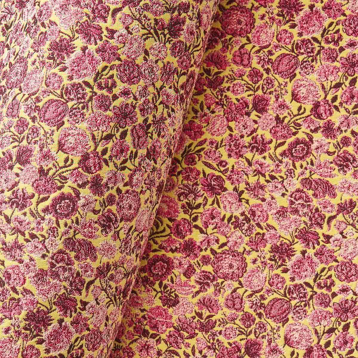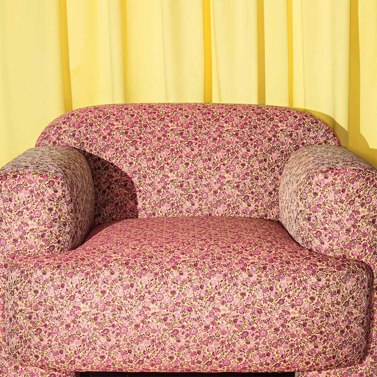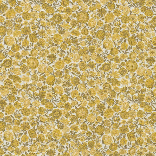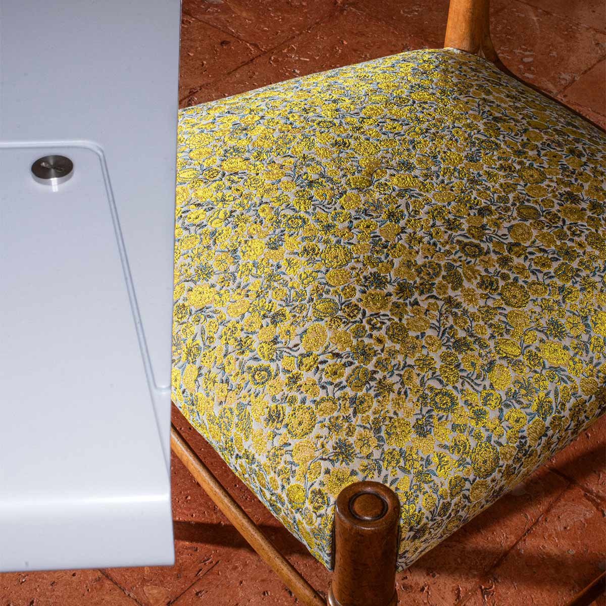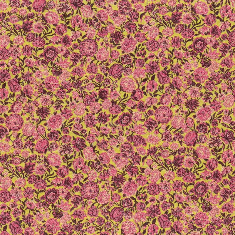 Millefleurs envoûte l’espace d’un baiser ardent de la nature. Roses, pivoines, œillets et autres fleurs étreignent cette toile, voilant, presque en totalité, son fond coloré. La palette chromatique vibrante de ce tissu jacquard allover signé Rubelli éclabousse chaque recoin d’une lueur estivale.
