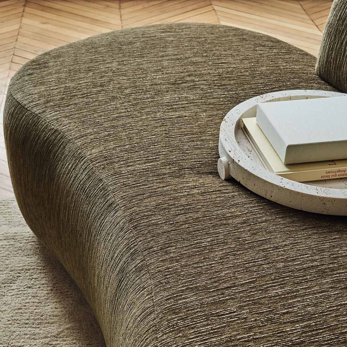 Avec le tissu Segreti, Casamance propose une version plus texturée du motif chiné. Le fond sobre est moucheté de fines raies légèrement embossées, tissées avec des fils clairs en chenille. Elles illustrent les vaguelettes tranquilles des canaux, où les dernières lueurs du jour semblent s’éterniser. La scène, témoin silencieux des secrets de Venise, se nappe de mystère et imprègne l’ambiance de sa sérénité.
