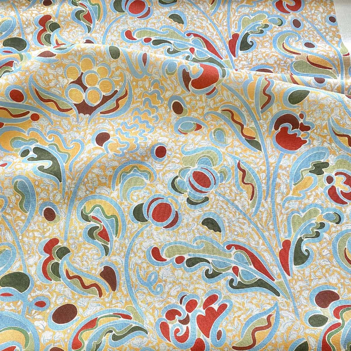 Carmen, un tissu créé par Claire de Quénetain, se pare d’une myriade de fleurs et de feuillages au charme organique. Courbes et volutes se déploient dans une symphonie de couleurs vives, évoquant la splendeur d’un jardin onirique sous un soleil d’été. Cette toile de lin et de coton conjugue raffinement et douceur tactile.