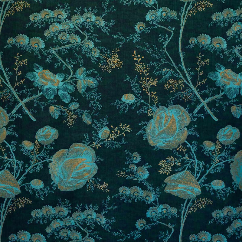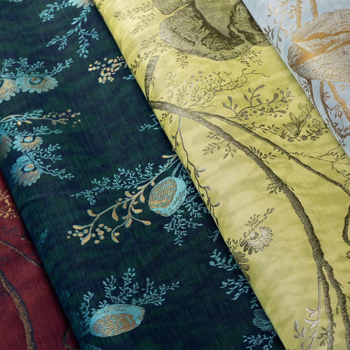 Kintsugi, un jacquard de Verel de Belval, s’inspire de l’art japonais du kintsugi., une pratique consiste à réparer les objets brisés avec de la laque dorée ou argentée. Composé de fleurs et de feuillages, son motif botanique révèle un équilibre délicat entre tradition et modernité. Ce tissu célèbre le savoir-faire ancestral avec une touche contemporaine.