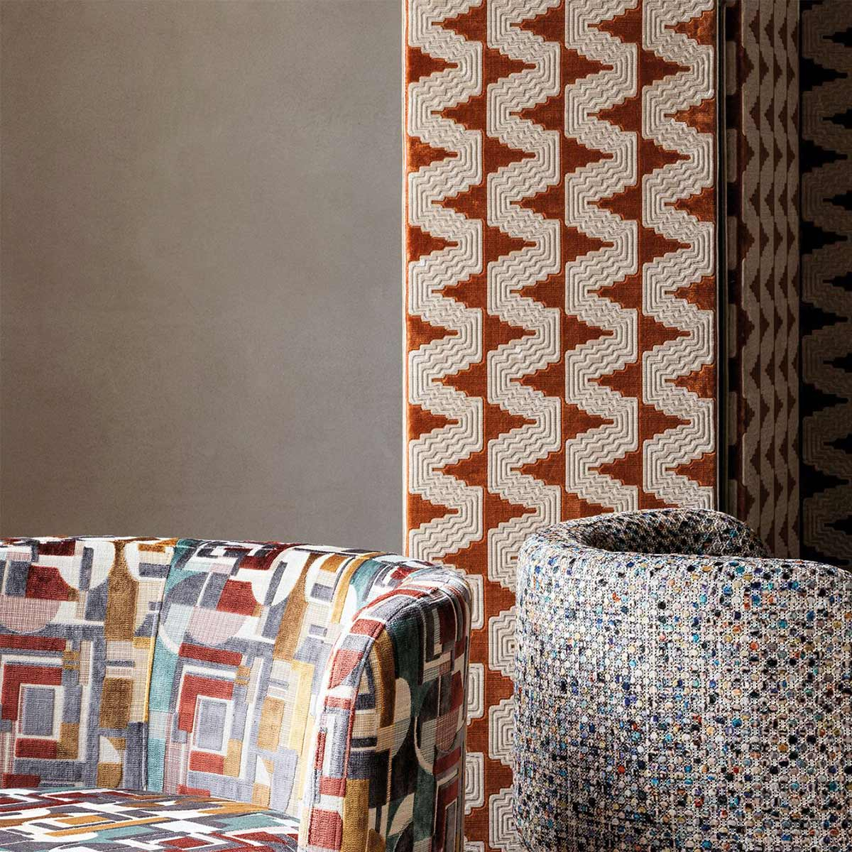 Le tissu Cavalli, imaginé par Osborne & Little, réinvente audacieusement le style classique. Il se pare d’un zigzag de bandes riches en détails et aux contours anguleux. Sa texture douce s’enrichit de reliefs subtils grâce au velours coupé et non-coupé. Cette création se dévoile dans des teintes tendres et vibrantes.