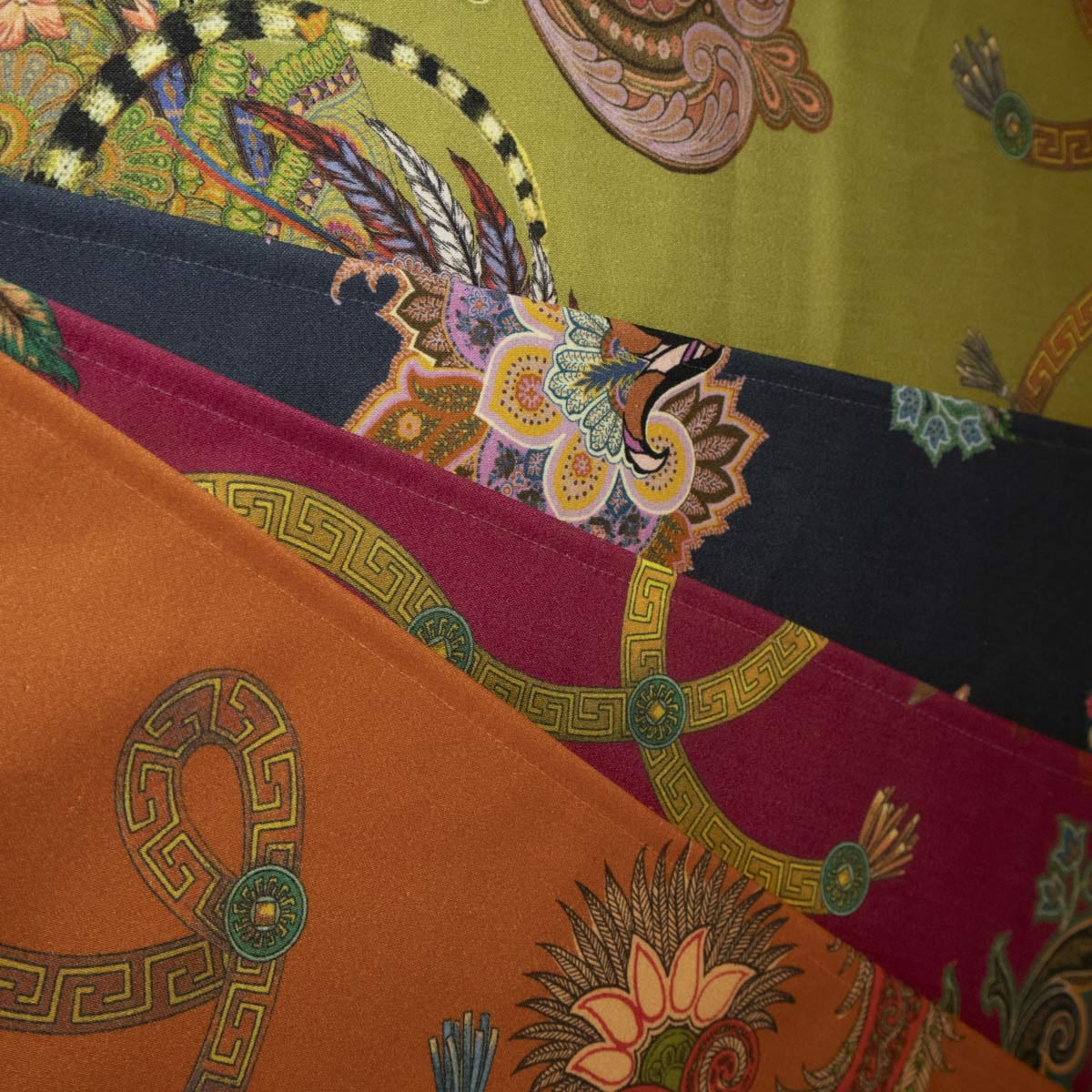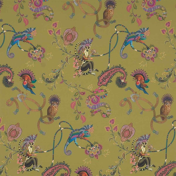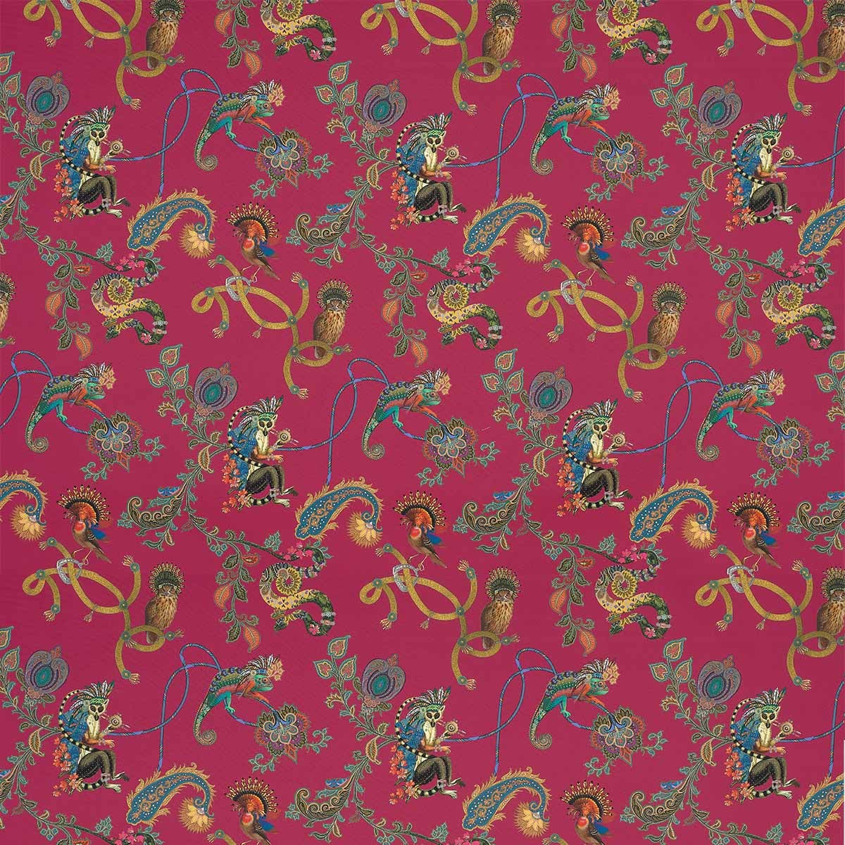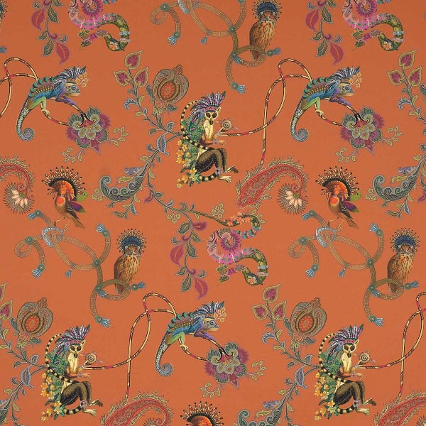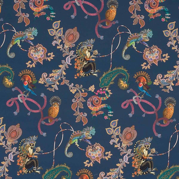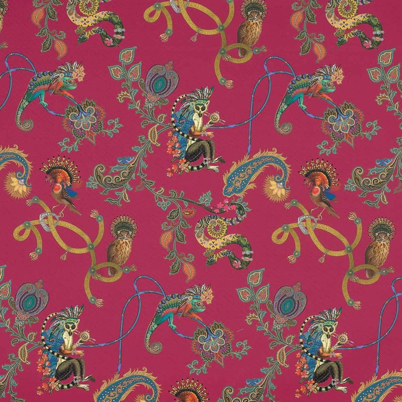 Le tissu Elanor d'Etro dévoile un univers enchanteur où la nature et l’imaginaire se rencontrent. Des oiseaux aux plumes éclatantes, des iguanes colorés et un lémurien avec des coiffes de chef indien sophistiqué prennent vie parmi des arabesques florales. Chaque détail du motif semble raconter une histoire, insufflant une dimension onirique et poétique à cette étoffe de coton.