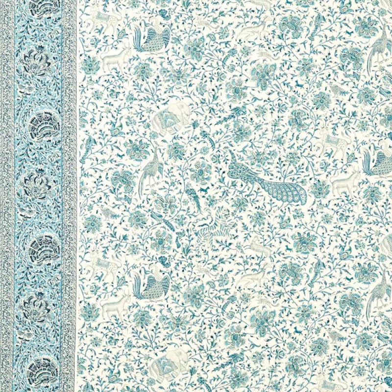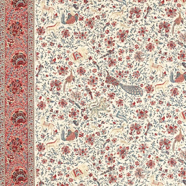 Muchal Menagerie est un tissu qui s’inspire d’une estampe Kalamkari du XIXe siècle. Au cœur d’une végétation décorative, une multitude d’animaux riche en détails prend vie avec finesse. Une bordure florale encadre cette scène exotique, apportant rythme et équilibre. Le mélange de lin et de coton confère une texture naturelle à cette toile, sublimée par le savoir-faire textile de Zoffany.