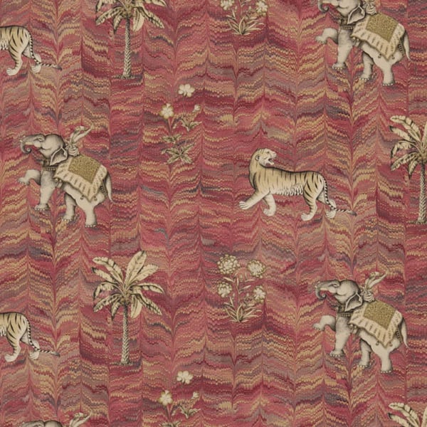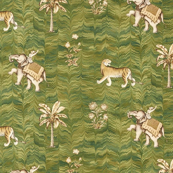Jaipur est un tissu de Zoffany au motif narratif, peuplé d’éléphants et de tigres inspirés des miniatures mogholes. Le décor s’anime sur un fond marbré à la main, aux ondulations organiques et irrégulières. L’ensemble évoque un paysage imaginaire fastueux, empreint d’un exotisme raffiné, sur une toile de lin pur.