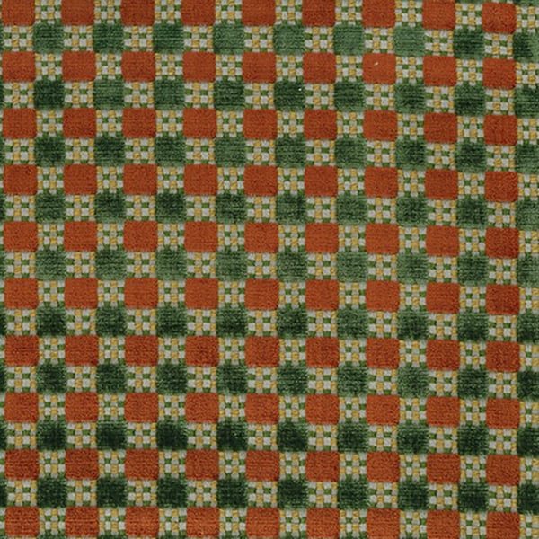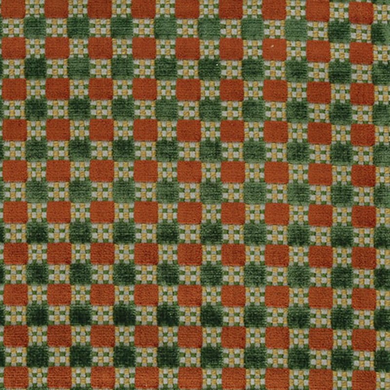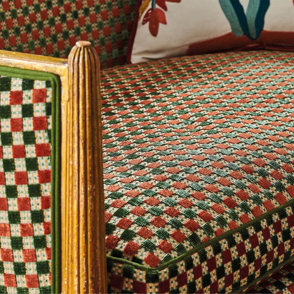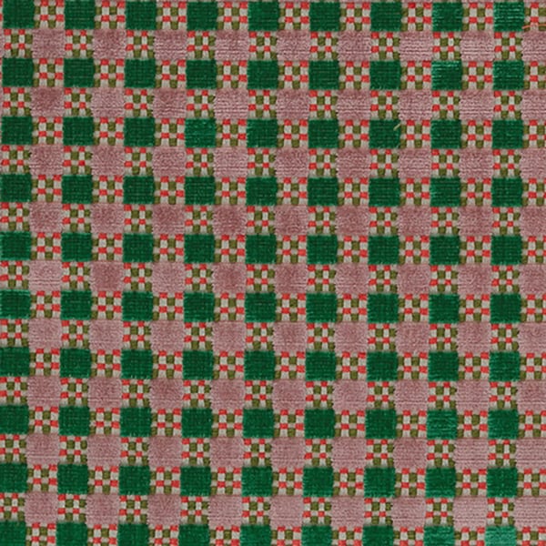 Le Theodora est un tissu d’ameublement signé Nina Campbell. Son motif est composé de carrés de velours délicatement texturés alternant avec de petites mosaïques multicolores. L’ensemble forme un quadrillage précis, évoquant un damier travaillé avec relief. Composé d’un mélange de coton, il présente une structure dense et un aspect subtilement tridimensionnel.