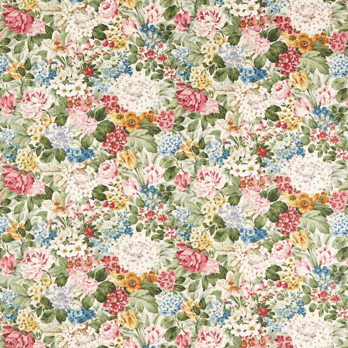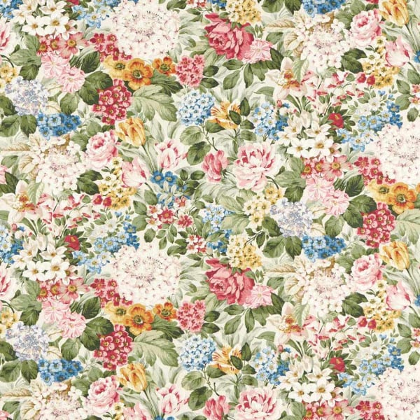 Un motif floral foisonnant se déploie sur le tissu Hydrangea & Rose signé Sanderson. Tulipes, hortensias et roses s’épanouissent dans une profusion de formes généreuses. Le dessin évoque un jardin en pleine floraison, structuré par un feuillage dense et vibrant. Cette étoffe en coton et chanvre révèle une composition aux détails graphiques maîtrisés.
