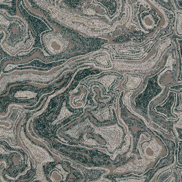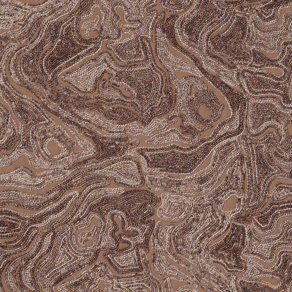 Benu Rumba Recycled est un tissu imaginé par Fischbacher. Des lignes entremêlées dessinent des formes mouvantes, semblables à des coupes de terrain ou à des strates minérales. Le motif est réalisé en broderie dense, conférant au textile une texture en relief tactile et expressive. Chaque sinuosité semble résonner comme une trace du temps, dans une composition sans centre ni frontière.