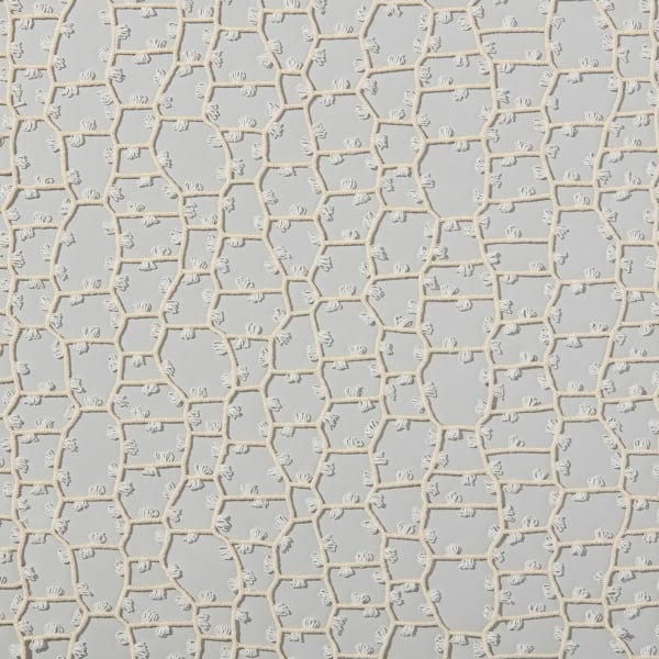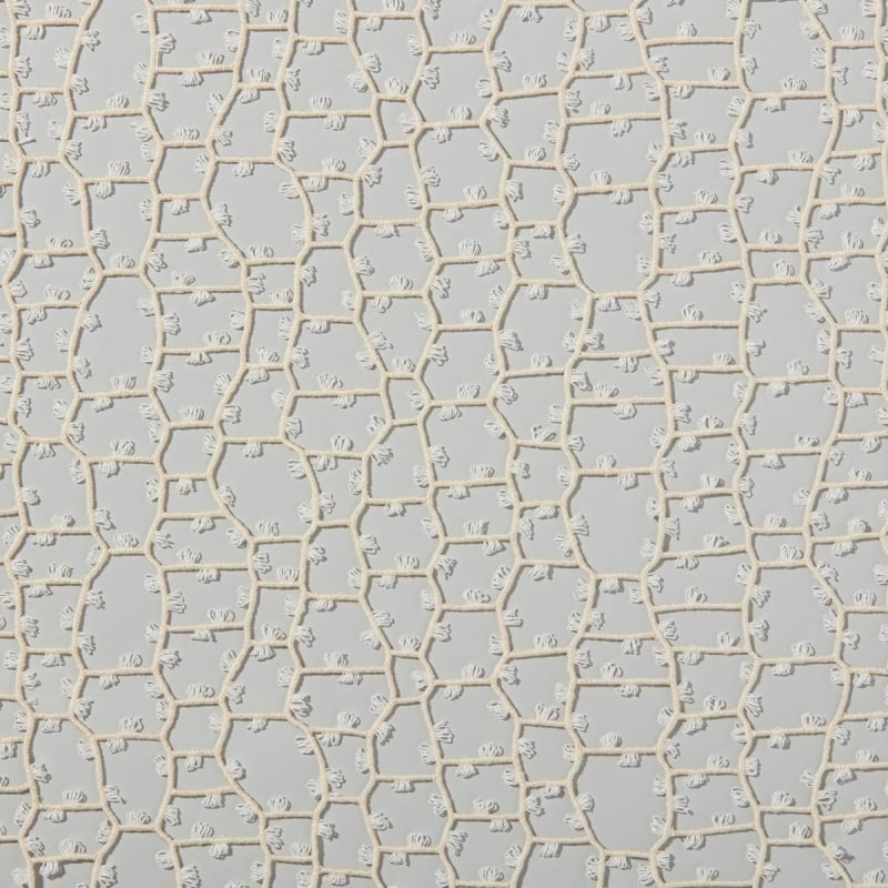 Le tissu Nature's Dialogue arbore un motif organique inspiré d’une cartographie cellulaire. Une broderie délicate trace un maillage irrégulier de lignes sinueuses, évoquant des structures naturelles vues de près. De petites boucles animent chaque cellule, semblables à des filaments suspendus. Le dessin, à la fois aérien et minutieux, capte l’œil par sa texture vivante. Cette composition signée Fischbacher célèbre la subtilité du trait, qui épouse les rythmes de la nature sans jamais les figer.