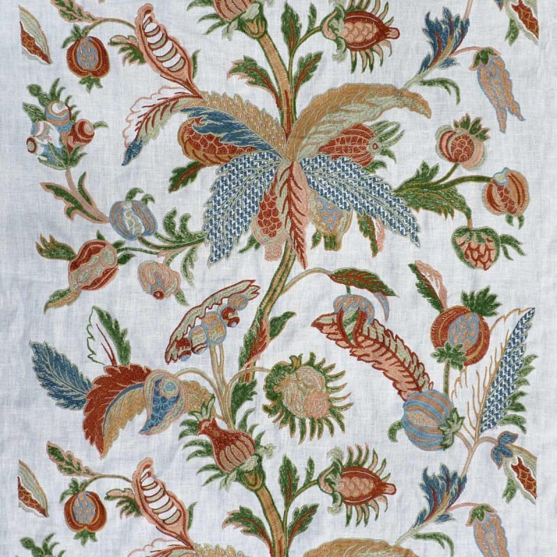 Le tissu d’ameublement Villars arbore un motif végétal classique. Sur sa toile en lin à la texture légère, un jardin foisonnant prend forme. Grandes palmes, capsules ornementales et feuillages denses s’y entrelacent pour dessiner une arabesque spectaculaire. Chaque détail est brodé, apportant du relief à ce motif riche et expressif signé Edmond Petit.