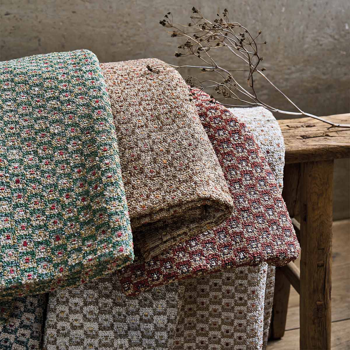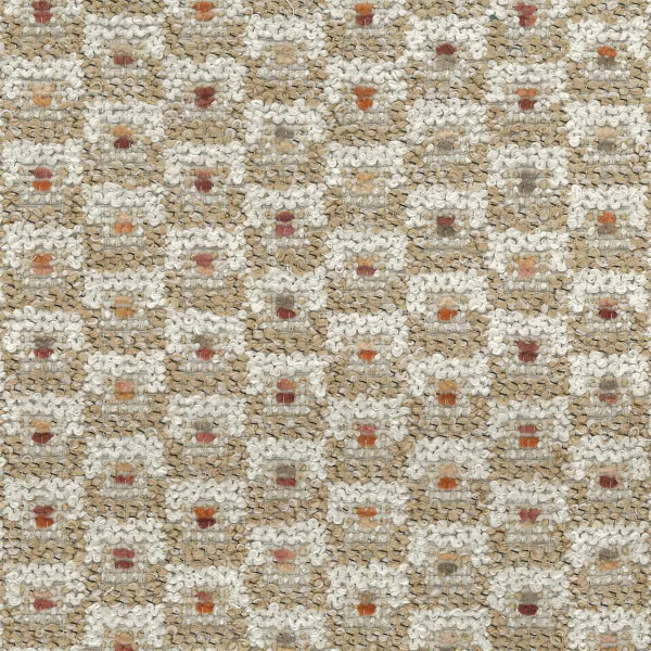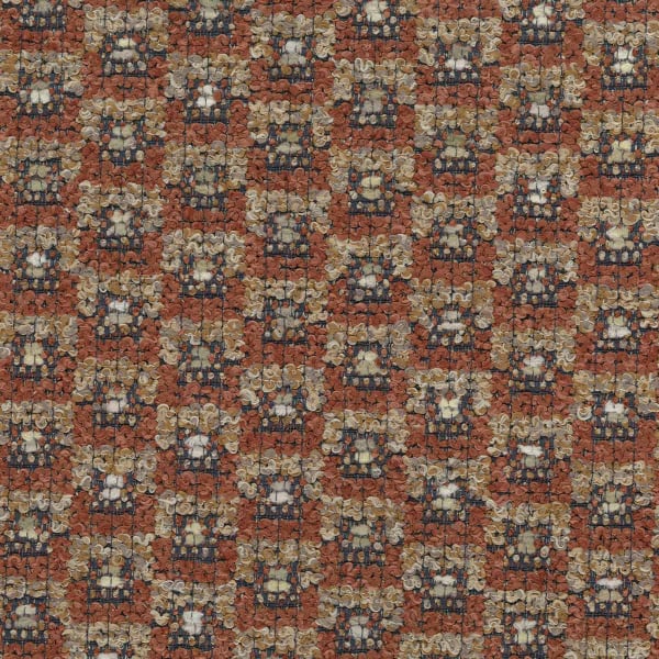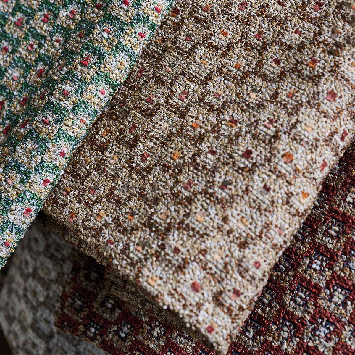Amoroso dévoile un motif quadrillé structuré et dense. Ce tissu d’ameublement signé Osborne and Little compose un damier ornemental riche en textures, rythmé par des carrés minutieusement agencés. Chaque forme semble cousue à la main, ponctuée de détails complexes qui rappellent les broderies anciennes. L’effet de relief suggère un toucher irrégulier, presque granuleux, proche de celui des étoffes artisanales.