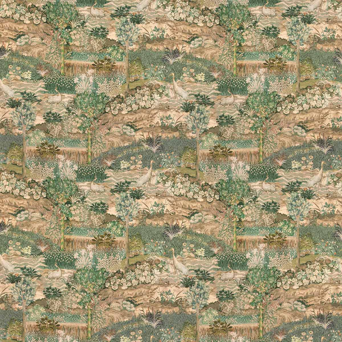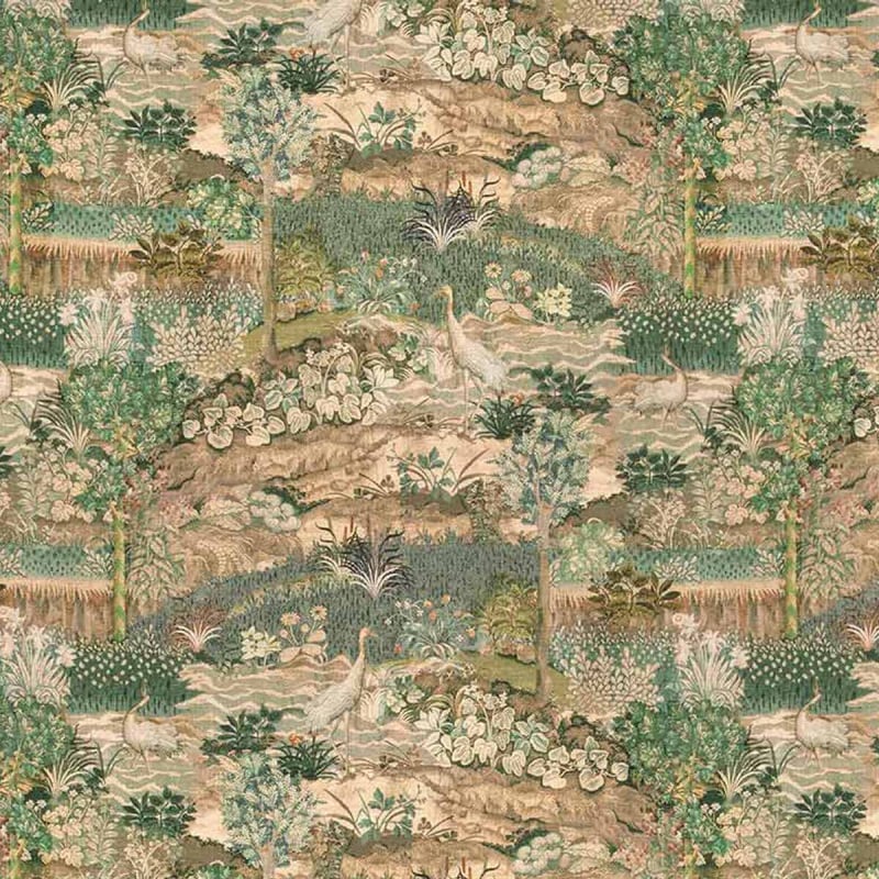 Dans une scène paisible, Palace Tapestry déploie un paysage imaginaire peuplé d’autruches qui traversent lentement une vallée ondoyante. Ce tissu, signé GP & J Baker, compose un monde végétal dense, structuré par des arbres élancés, des rivières sinueuses et une flore abondante. Chaque détail évoque une nature idyllique, presque mystique, comme extraite d’un récit ancien. Le dessin, finement travaillé, capte le mouvement tranquille des animaux et la délicatesse du décor.
