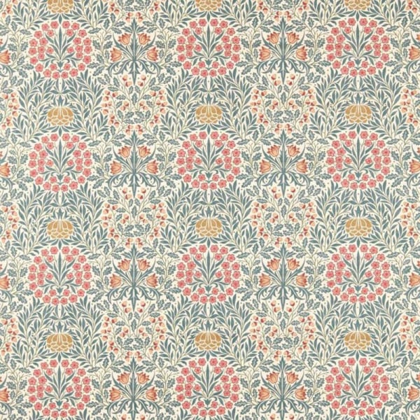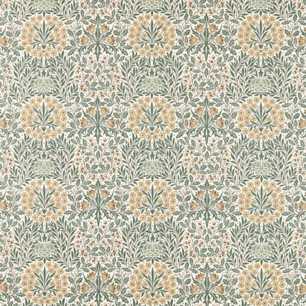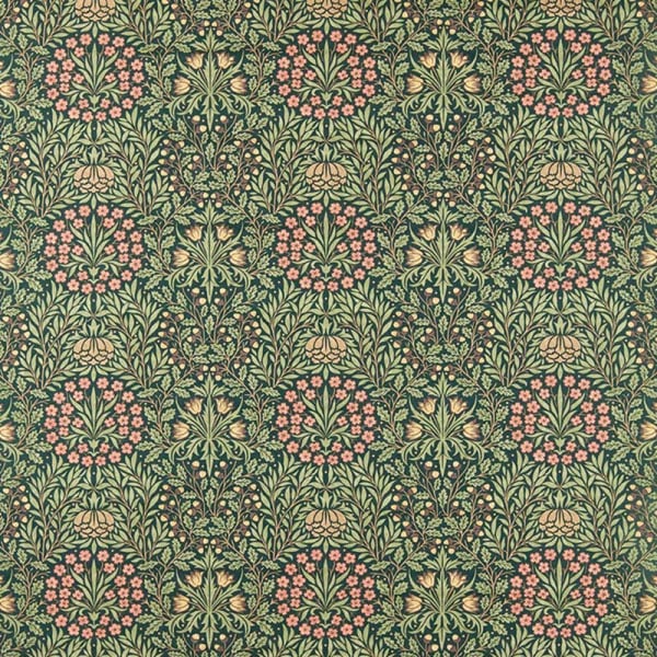 Daisy & Oak est un tissu au motif floral ornemental composé d’un enchevêtrement structuré de couronnes végétales. Les feuilles se croisent dans un rythme régulier, plein de mouvement. De petites marguerites parsèment l’ensemble, tandis que des branches de chêne stylisées encadrent la composition. Morris and Co restitue ici une vision décorative où la nature suit un agencement méthodique, fondé sur la répétition des formes.