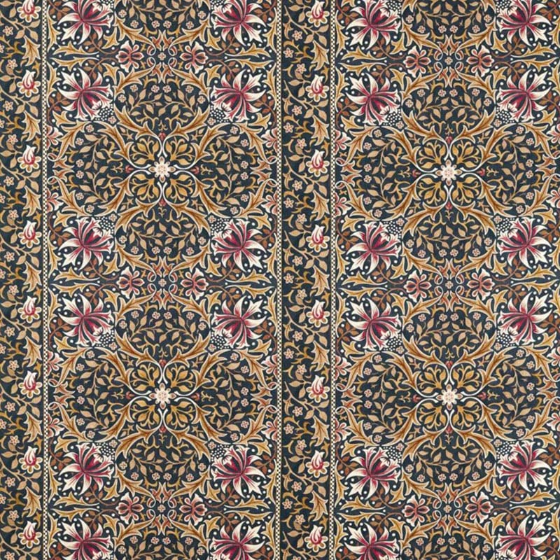 Walthamstow est un tissu structuré autour d’un motif floral ornemental inspiré des compositions complexes de l’époque victorienne. Des médaillons feuillus s’organisent avec rigueur, entrelacés de tiges sinueuses et de fleurs stylisées. Le rythme est souligné par des bandes verticales, qui rappellent les bordures textiles anciennes. Ce tissu reflète l’univers singulier de Morris and Co, dans un jeu de lignes qui évoque le raffinement du dessin artisanal.