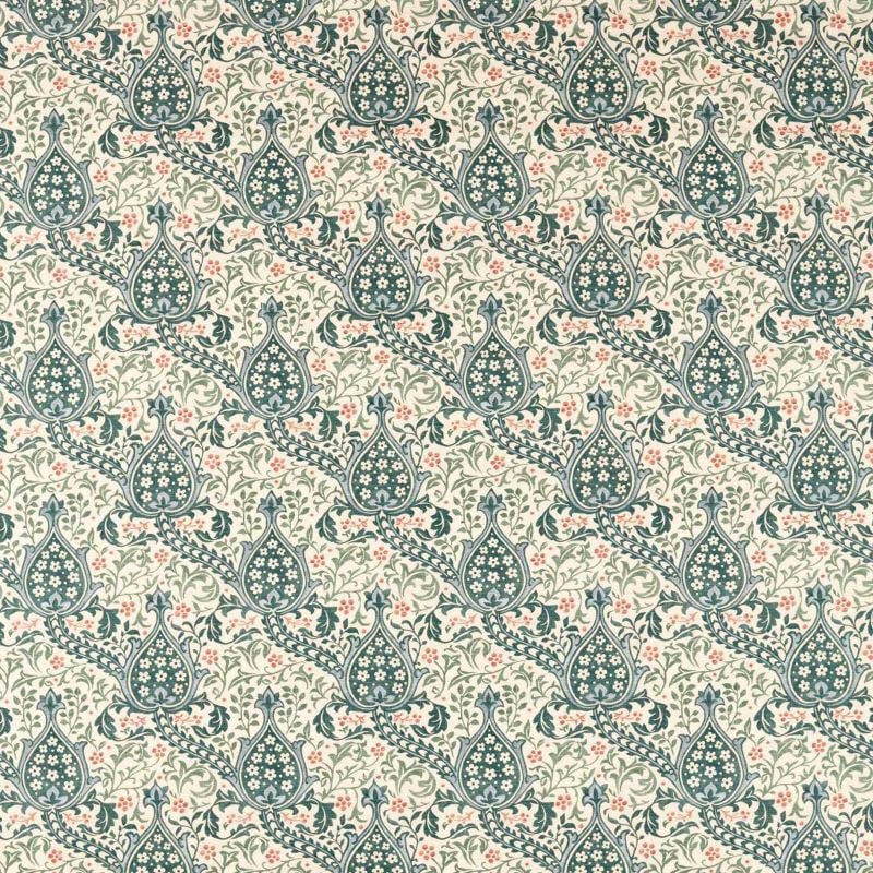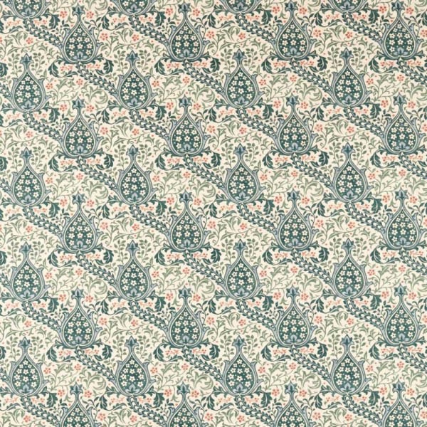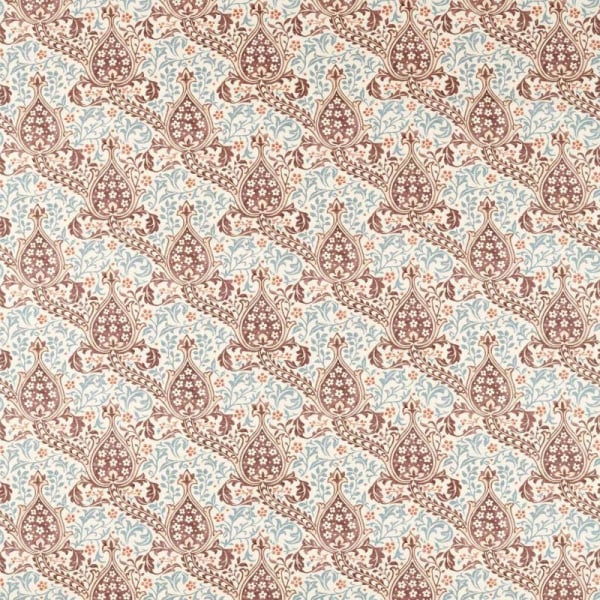Persian Tulip est un tissu au motif floral stylisé, signé Morris & Co. Des formes en amande évoquant des tulipes abritent une constellation de petites fleurs soigneusement disposées. Les tiges sinueuses croisent des feuillages courbes, instaurant un rythme à la fois organique et fluide. En arrière-plan, de fins rameaux fleuris se répètent avec régularité, enrichissant l’ensemble. Cette création déploie une structure ornementale inspirée des arts décoratifs orientaux.