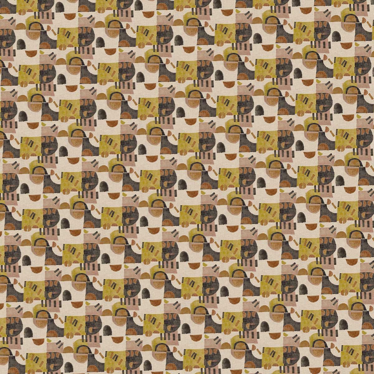 Rhapsody expose une mosaïque graphique composée de figures géométriques libres. Le motif abstrait présente des demi-cercles, des rectangles et des lignes superposés. Les formes, parfois pleines, parfois texturées, s'entrelacent dans une répétition dynamique. Ce tissu signé Ado montre un dessin structuré par blocs, répartis sur toute la surface.