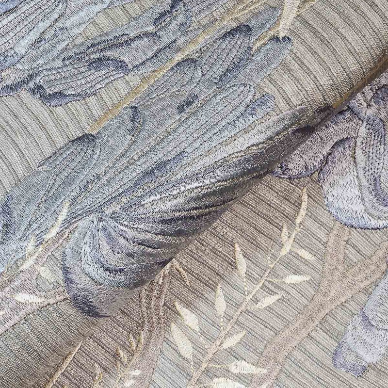 Signé Armani Casa, le tissu Valparaiso se pare d’un motif végétal brodé. Fleurs et feuilles majestueuses, stylisées, s’élancent entre des branches sinueuses sur un fond finement strié. Les reliefs soyeux suggèrent un mouvement fluide et organique. La lumière glisse sur cette toile texturée et révèle une surface sculpturale au toucher raffiné.