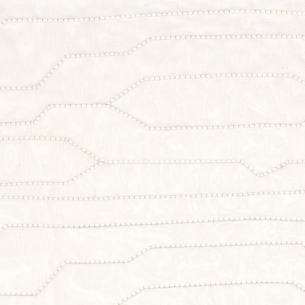 Le tissu Cortège déploie un motif géométrique, à la fois précis et irrégulier sur une base de lin et coton. Il évoque des lignes mouvantes, presque cartographiques, qui s’entrelacent avec subtilité. Le dessin, rehaussé d’un effet de corde appliquée, suggère un mouvement silencieux en tridimensionnel. Réalisée en broderie, la composition révèle le savoir-faire délicat de Casamance.