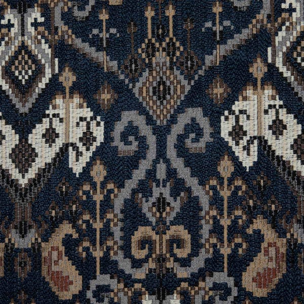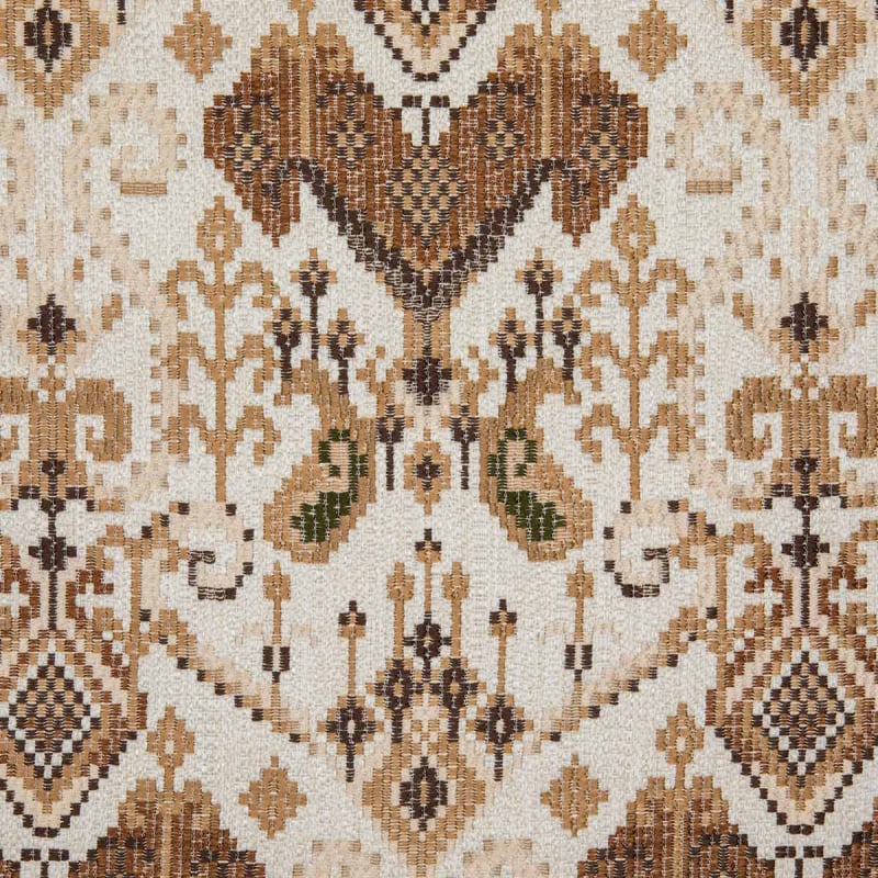 Lelièvre dévoile Orchila, un tissu à la texture dense, inspiré d’un ikat revisité. Le motif géométrique se construit en miroir, entre trames chinées et ornementations stylisées. Le dessin impose un tempo régulier, presque architectural, qui structure la matière et capte le regard. Chaque détail révèle un savoir-faire textile à l’allure contemporaine.