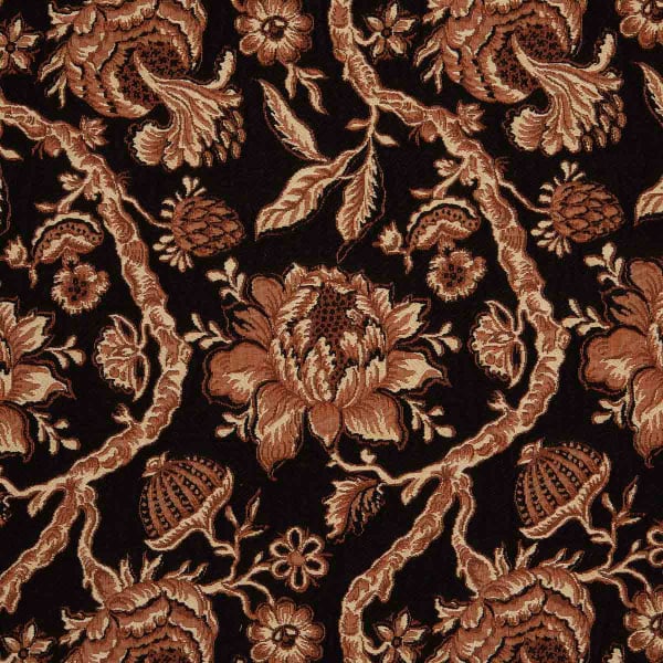 Édité par Quenin, le tissu Poème révèle un motif floral au dessin généreux. Des tiges sinueuses parcourent la surface, ponctuées de fleurs opulentes et de feuillages finement nervurés. La structure évoque un herbier stylisé où chaque courbe semble suivre un mouvement ancien. Majoritairement composé de coton, il possède un toucher souple et naturel.