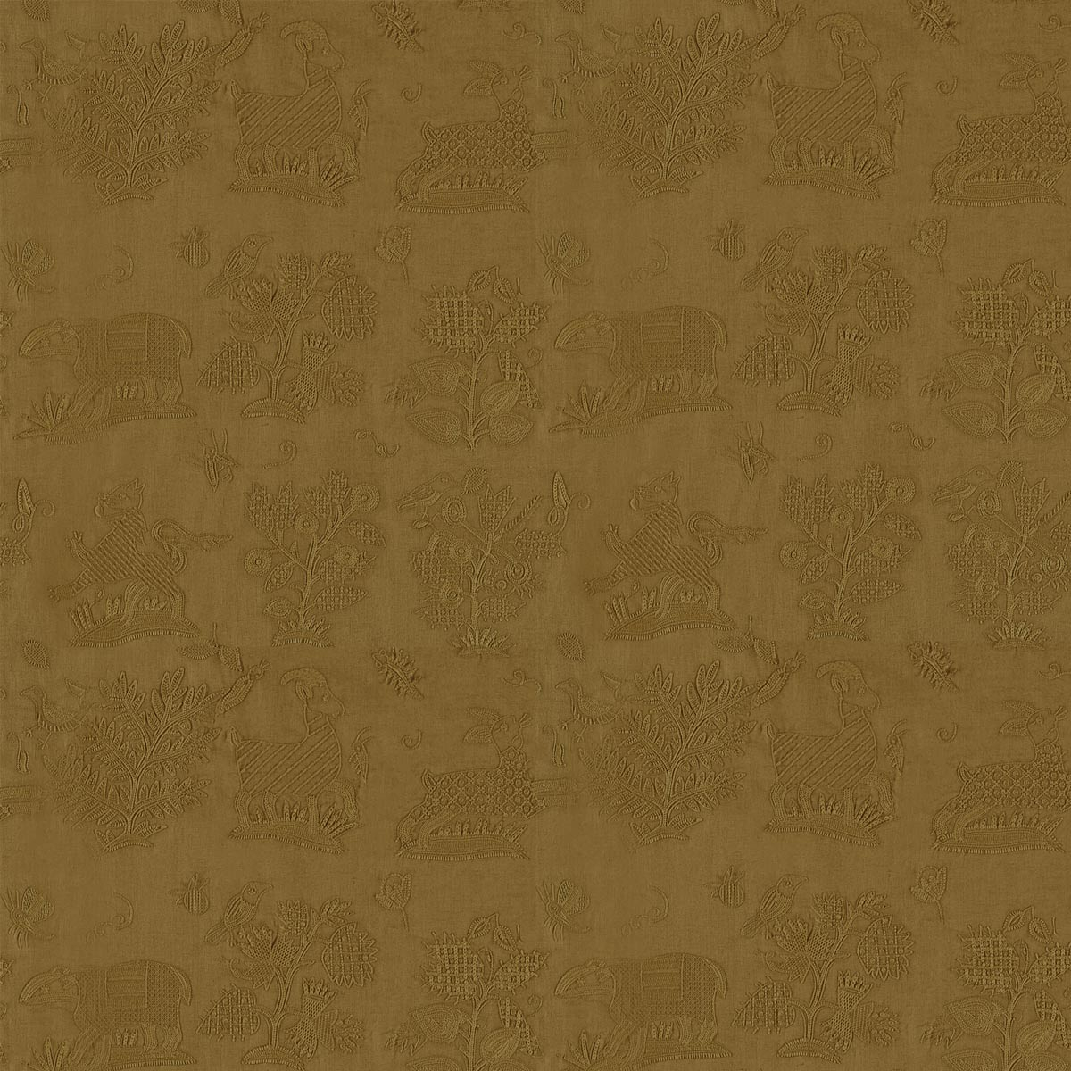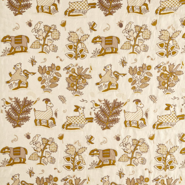 Sanderson réinvente la tradition avec le tissu Medieval Embroidery, où un bestiaire imaginaire se mêle à une flore stylisée. Le motif fantaisiste reprend les contours naïfs d’un échantillonneur ancien, inspiré d’un document du XVIIe siècle. Composée majoritairement de lin, cette étoffe évoque la souplesse brute des fibres naturelles. Chaque figure, brodée avec minutie, imprime une présence tactile et vibrante.