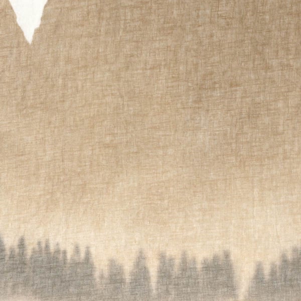 Mirage de Casamance est un tissu au motif paysager où se devine une forêt aux contours estompés, comme suspendue dans une brume silencieuse. Le dessin suggère une ligne d’arbres diffuse, dont les silhouettes se fondent dans la trame vaporeuse. Sa grande largeur accentue l’effet panoramique d’un horizon qui s’étire avec calme. Entièrement en lin, il révèle une texture vivante, ancrée dans une présence tangible.