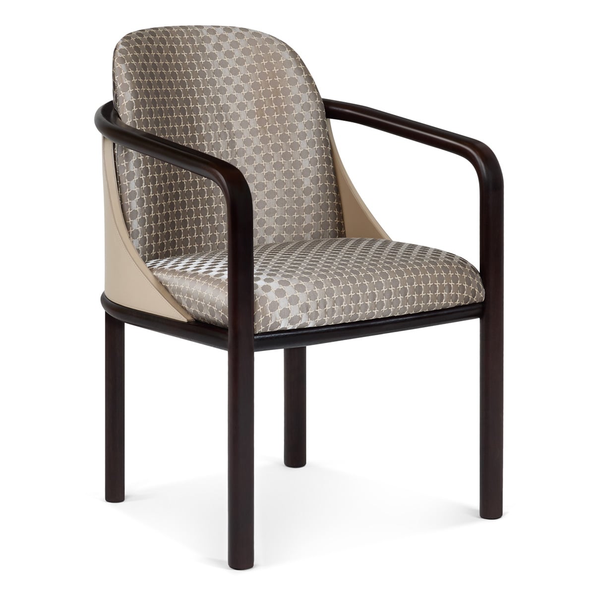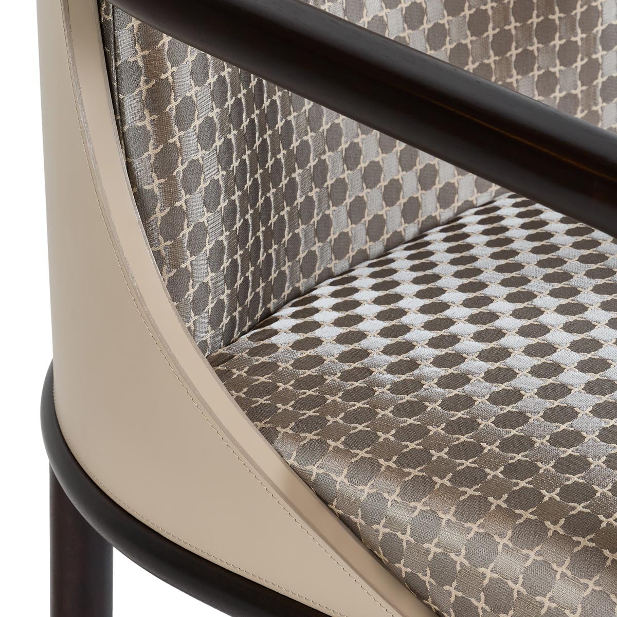 Armani Casa signe le tissu Arno, une composition textile au motif géométrique raffiné. Un réseau de petits carrés ponctués de formes arrondies rythme la surface avec subtilité. Le dessin se déploie en une trame régulière, presque architecturée. Des reflets métalliques effleurent la matière et animent le relief avec discrétion et finesse.