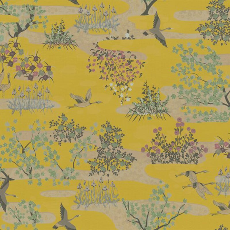 Lucky Charm signé Zimmer + Rohde est un tissu au motif figuratif où des grues traversent un paysage printanier nourri d’influences asiatiques. Arbres sinueux, massifs fleuris et îlots végétaux composent une scène paisible, ponctuée de nuées légères. L’ensemble respire le calme d’un jardin humide après la pluie. Partiellement en coton et en soie, l’étoffe présente une texture vivante, souple au toucher.