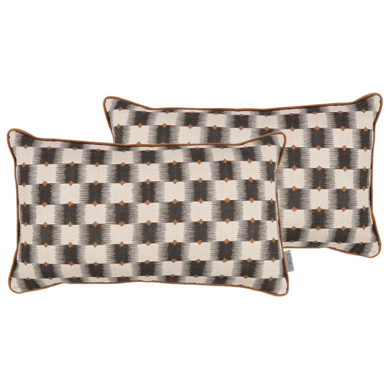 The Ziri square cushion reveals a geometric pattern structured by a grid of light and dark shapes. Dynamic hatching animates the surface, creating a visual vibration effect. At each intersection, a small colored cross introduces a regular punctuation on the whole. Made of linen and cotton, this Romo model is edged with discreet piping for a neat finish.
