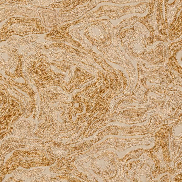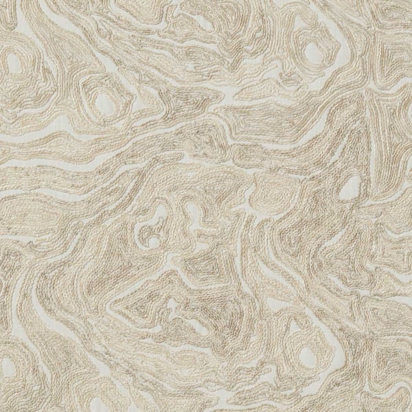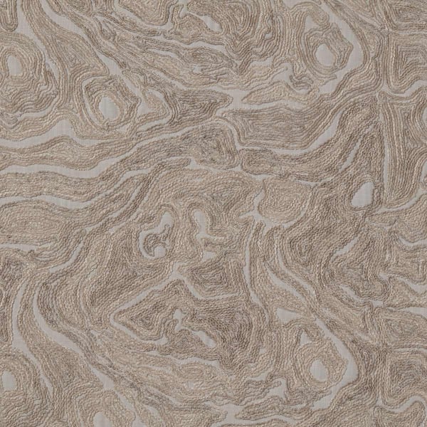 Benu Rumba Recycled is a fabric designed by Fischbacher. Intertwined lines draw moving shapes, similar to sections of land or mineral strata. The pattern is made of dense embroidery, giving the textile a tactile and expressive relief texture. Each sinuosity seems to resonate like a trace of time, in a composition without center or border.