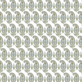 The Dharma fabric presents a repeated ethnic pattern that punctuates the weft with an aesthetic borrowed from distant decorative arts. This structured design deploys a subtle visual energy, carried by the regularity of a small stylized paisley pattern. The shapes evoke an artisanal heritage in a vibrant and orderly composition. Signed Gastón y Daniela, this textile reflects a graphic language with deep cultural resonances.