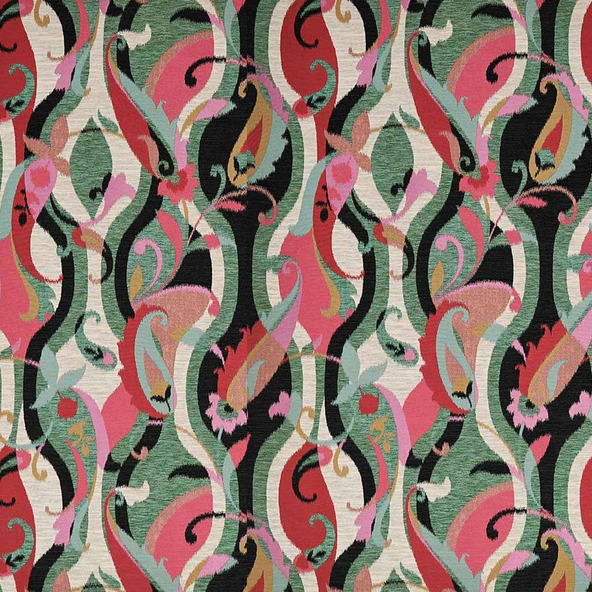 Osborne and Little unveils the Castillo fabric, a dense jacquard where floral scrolls and geometric sinuosities intertwine. The boldly stylized paisley pattern traces contemporary arabesques. Its embossed texture recalls the finesse of worked marquetry, between precise inlays and material effects. This fabric unfolds a vibrant presence and combines ornamentation and graphics.