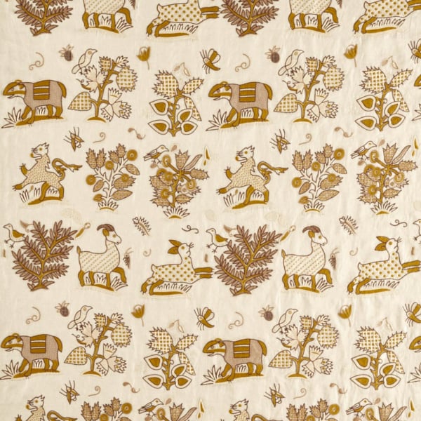 Sanderson reinvents tradition with the Medieval Embroidery fabric, in which an imaginary bestiary intertwines with stylized flora. The whimsical pattern echoes the simple contours of an old sampler, inspired by a 17th-century document. Composed primarily of linen, this fabric evokes the raw suppleness of natural fibers. Each figure, meticulously embroidered, creates a tactile and vibrant presence.