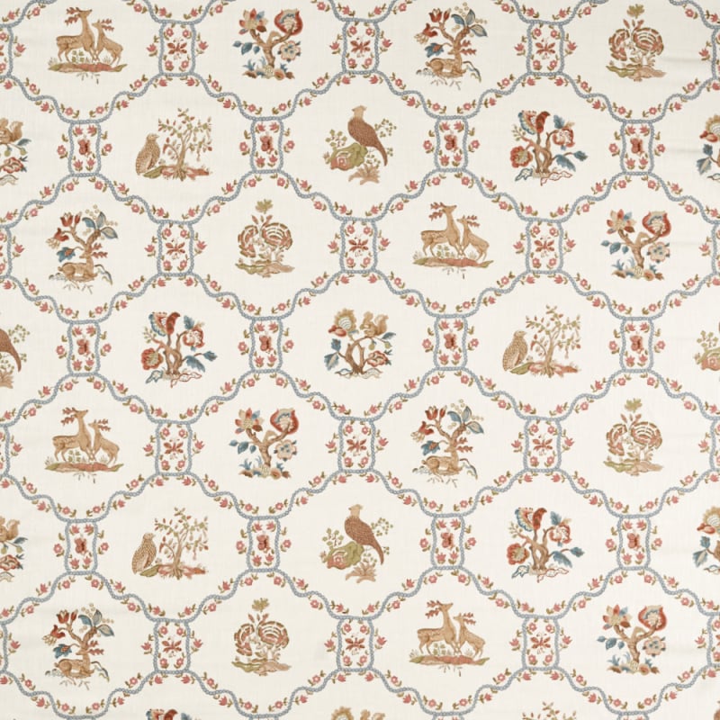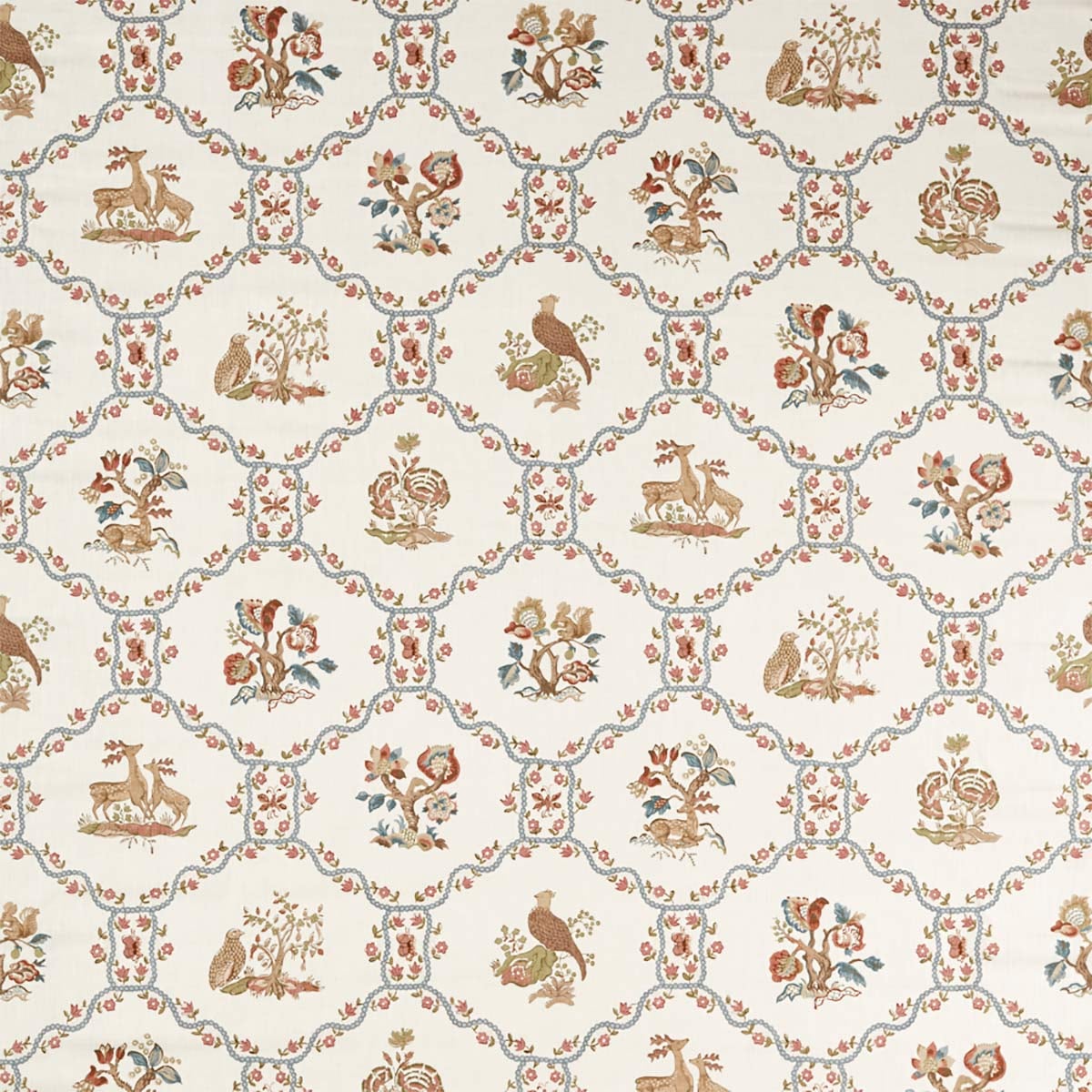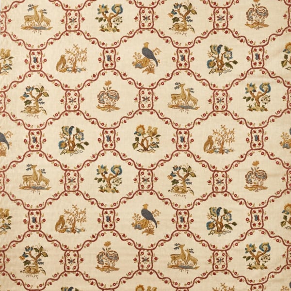 With Partridge Pear, Sanderson creates a meticulous scene that is both dense and orderly. This fabric features an octagonal latticework populated by deer, birds, squirrels, and stylized trees. Inspired by Jacobite traditions, the pattern unfolds as a meticulously crafted fresco of plants and animals. Each embroidered medallion seems to capture a fragment of nature frozen in time.