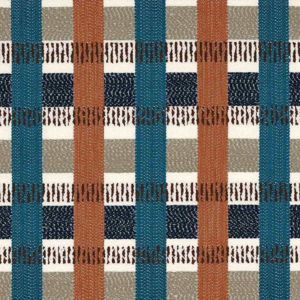 The Santana fabric by Casamance features a geometric pattern structured by a precise interweaving of vertical and horizontal bands. The design alternates between regular rhythms and punctuated lines, creating a dense and vibrant graphic pattern. Its bold texture underscores the precision of the grid pattern. Designed to withstand outdoor conditions, this textile maintains its shape and appearance over time.