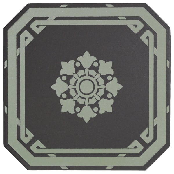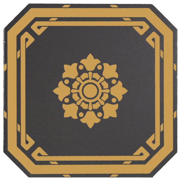 The Ottagono Decoro Black porcelain stoneware, by Ceramiche Grazia, evokes a central floral rosette, set in an octagonal geometry with highlighted angles. Linear borders, punctuated by discreet designs, structure the ornamental ensemble with measure. Each element seems to interact carefully in a meticulously thought-out composition. In porcelain stoneware, this tile combines mineral density and graphic finesse.