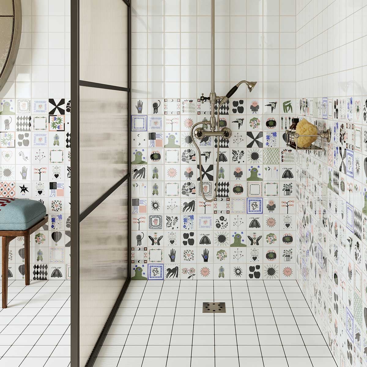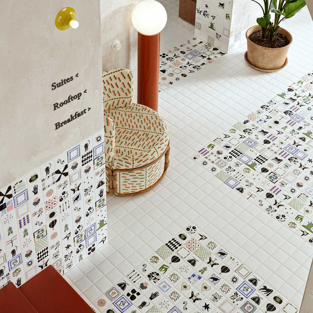 41zero42 presents Caravan porcelain tile, a composition featuring a figurative motif with a variety of designs. Each tile reveals a unique visual universe with clean contours, combining symbols and free-form shapes. The finish reveals the precision of the lines and the richness of the design. Together, they create a vibrant, rhythmic, and expressive fresco.