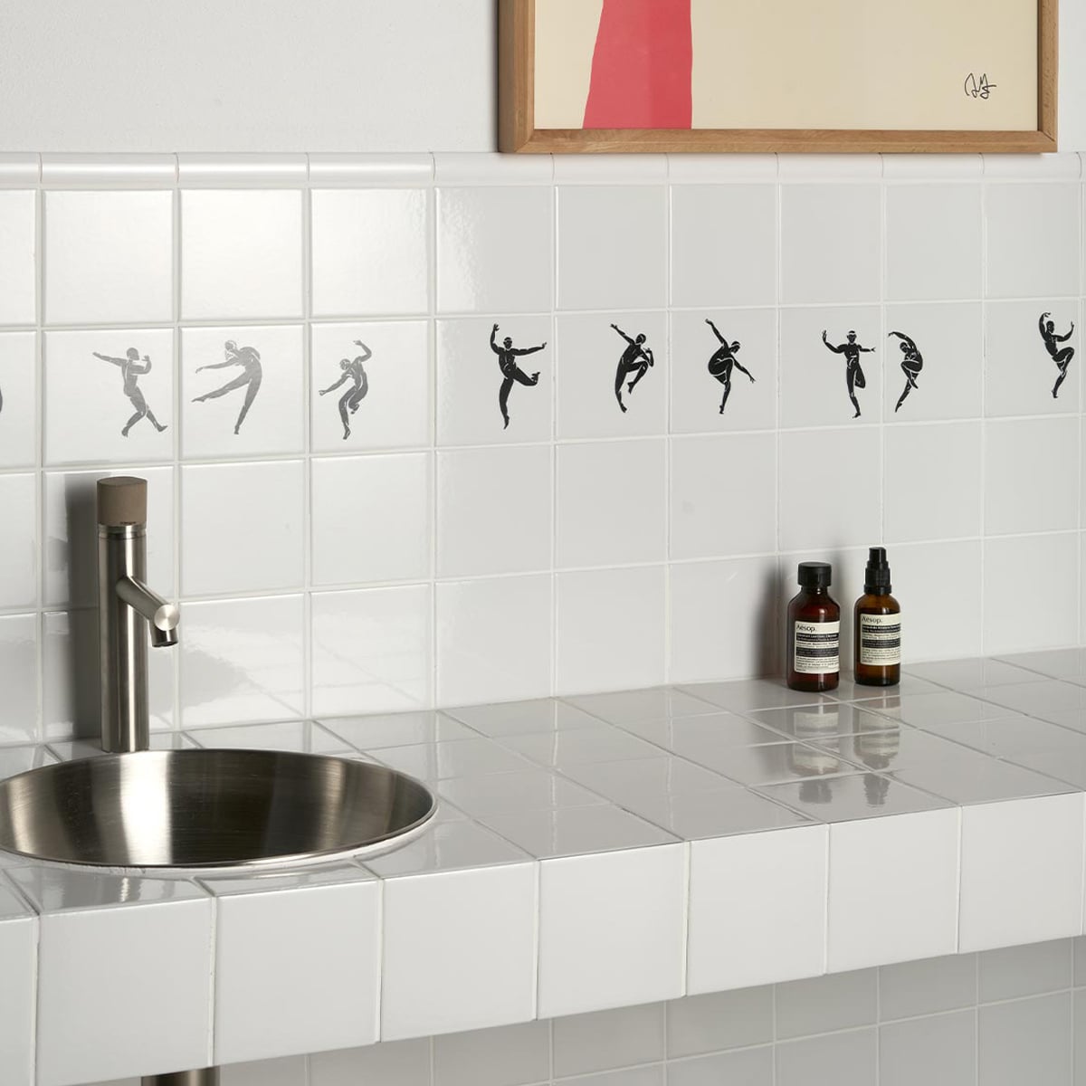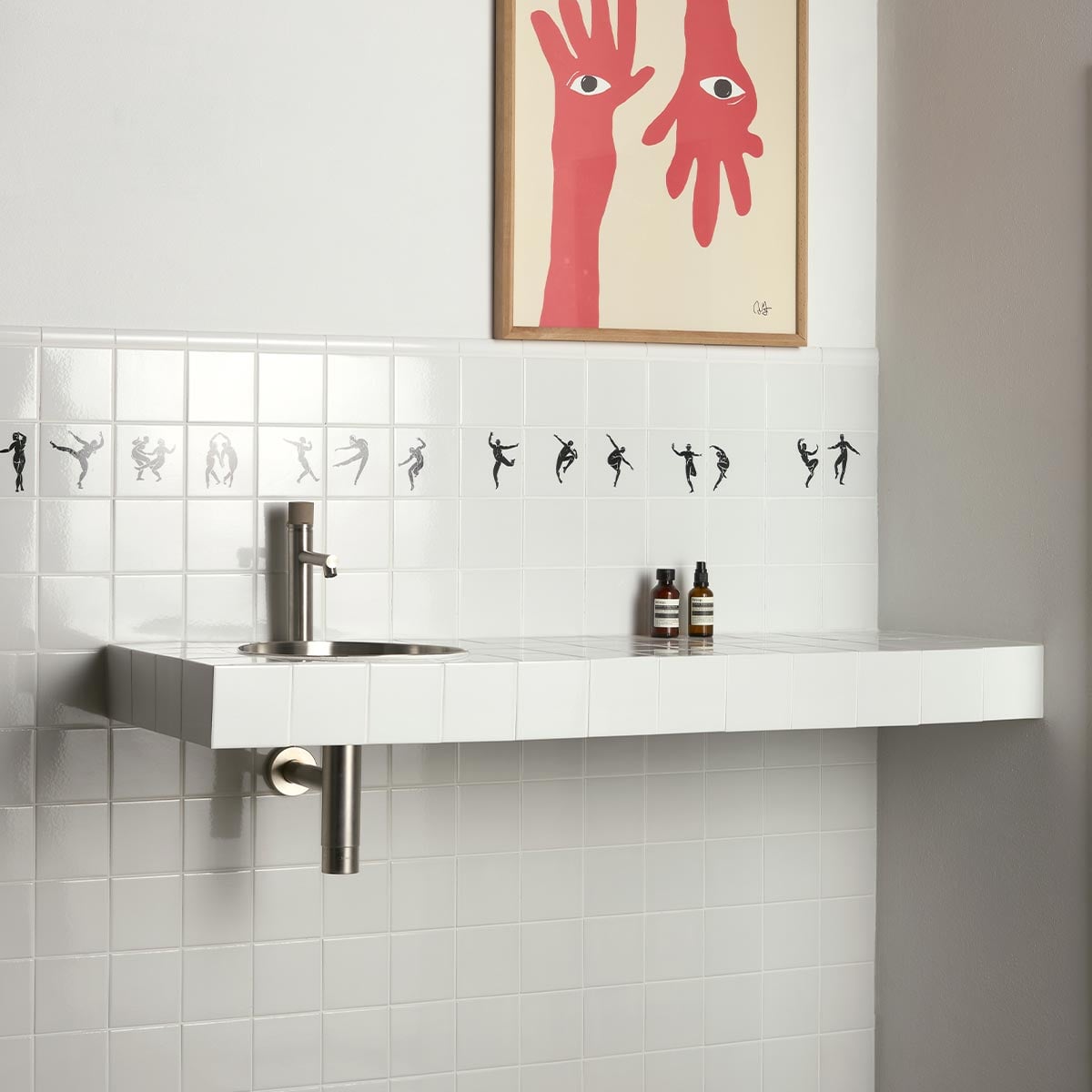 Designed by 41zero42, the Dance porcelain stoneware tile features a figurative pattern populated by silhouettes in motion. Each tile reveals a unique design, captured in the instant of a gesture. The clean lines precisely structure the surface. This graphic language imbues the material with rhythm and depth, like a subtle, silent, suspended choreography.