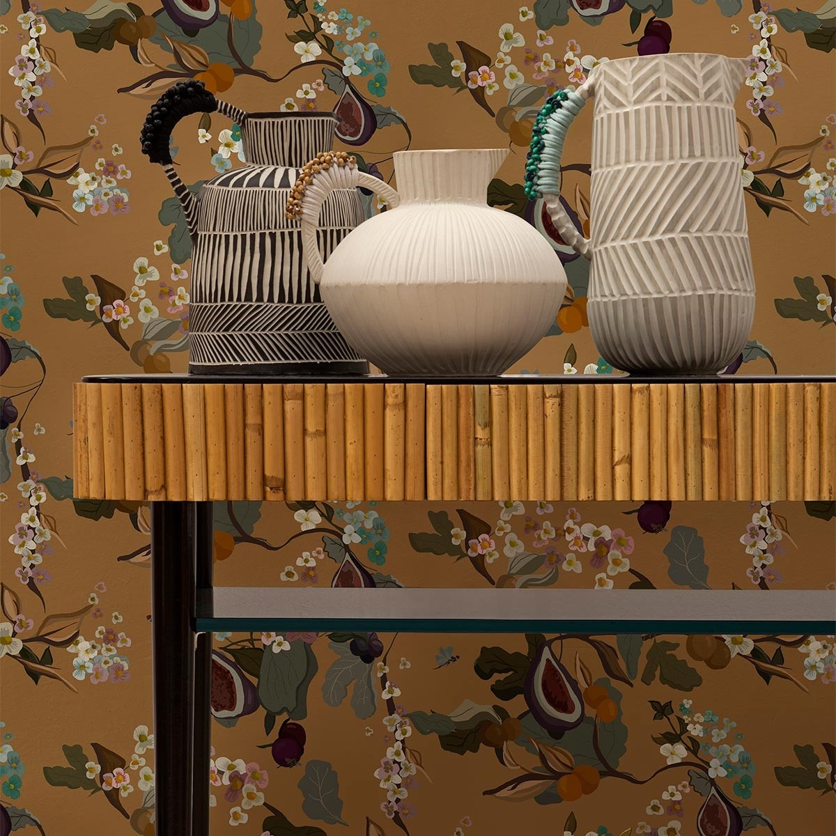 The renowned, romantic and exotic Spanish flora is depicted by Joselu Montojo in the Fruits creation. The designer highlights the charming versions of a half-cut fig and pokpoks with softly drawn flowers. Polished by a plain background, the overall brings out a fresh and light vibe.
