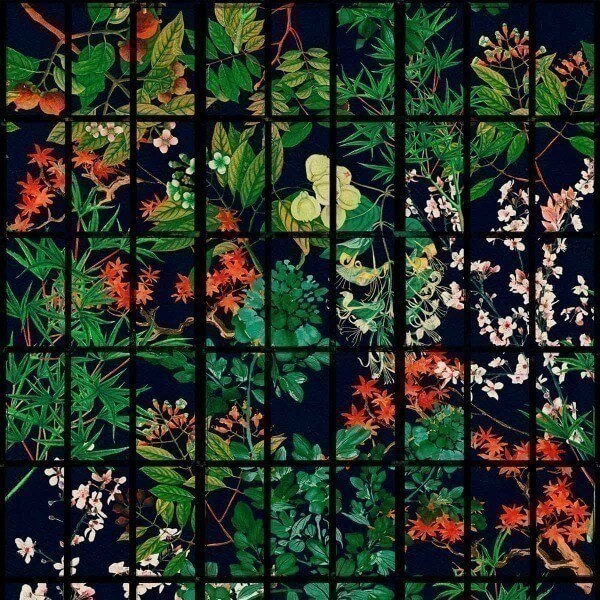 The Japanese Garden panel displays a view through a wooden Japanese window into a garden. Composed of a large variety of plants, this pattern features fruits, leaves and flowers of all kind. Happening by night or by day, depending on the variation, this model is characterized by the intensity of its natural colors.