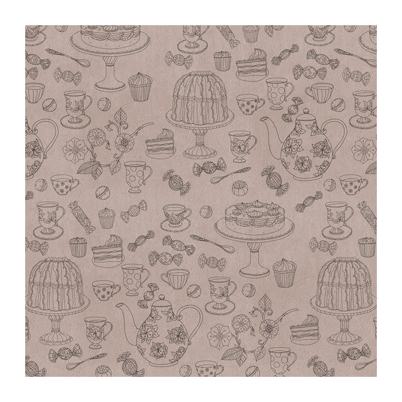 The Coffee Time panel design features a design of tea sets and snacks for snack time. Cakes, candies and cups make up this romantic design with a plain bottom. The illustration of this wall covering accompanies the gourmet breaks in your rooms.