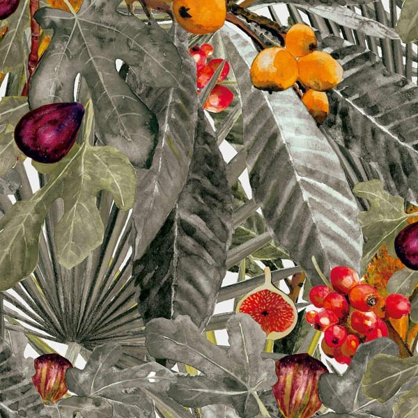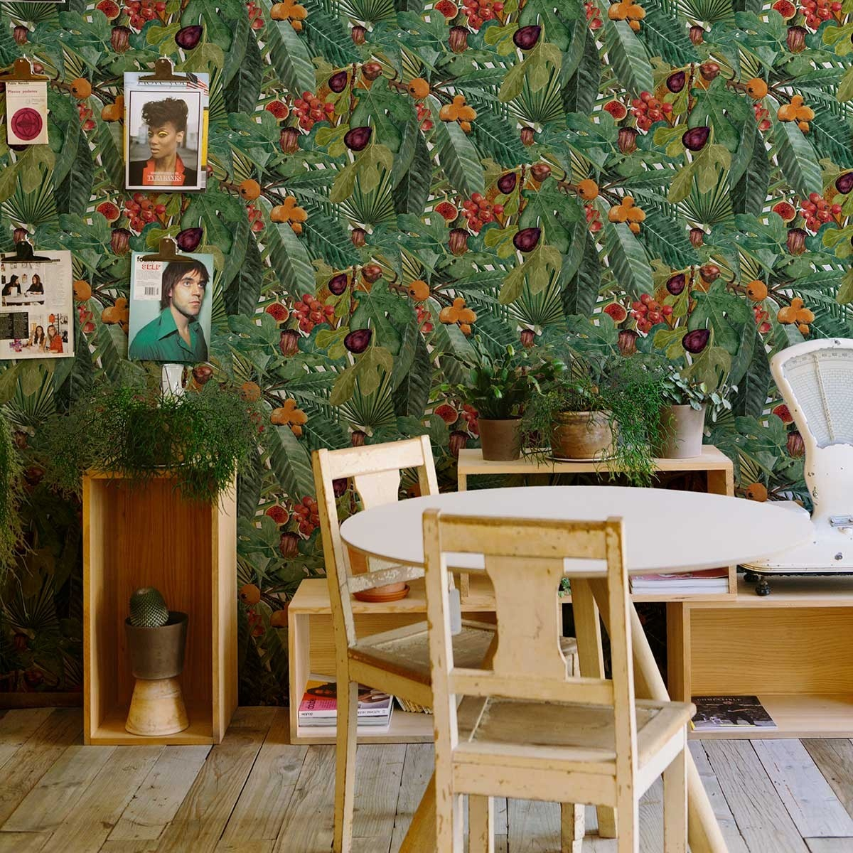 Inspired by the motif of the Vegetable wallcovering, the tropical design of the Neo-Vegetable wallpaper highlights various exotic fruits in the middle of palm leaves. The vegetation sports natural hues for an authentic rendering. This wall decoration brings a warm touch to any interior.