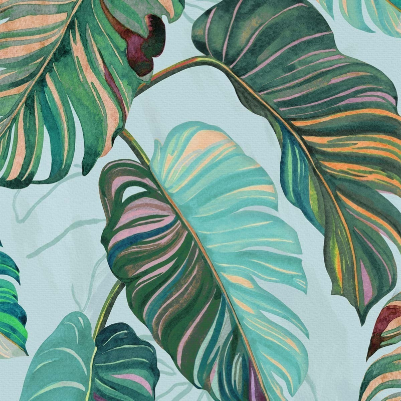 Carioca wallpaper illustrates the charm of the ample and curvilinear shapes of Monstera Deliciosa, a plant native to Brazil. Accented by slightly degraded and cool hues, the leaves contrast with the neutral shade of the plain background. This Coordonné wall decoration gives a note of freshness to interiors.