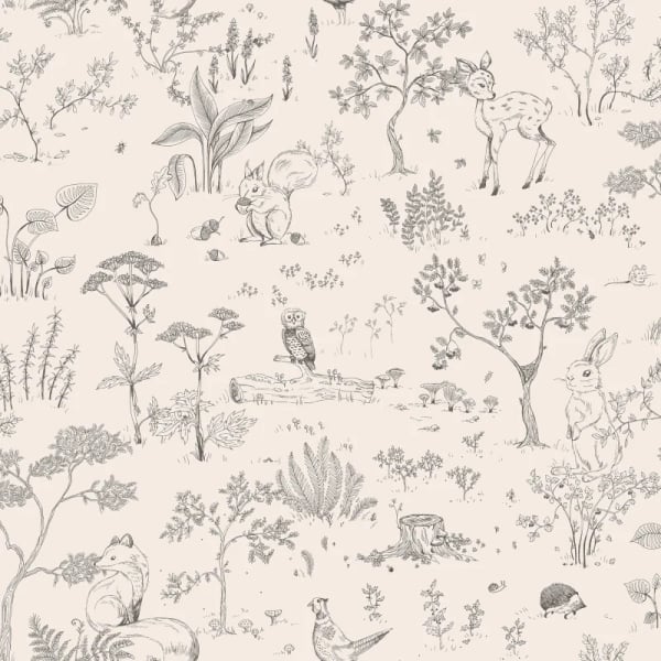 The Hollie wallpaper design features squirrels and fawns drawn amidst various plants and shrubs. This illustration drawn in a light shade contrasts with its plain background. Created by Swedish designer Sara Bergqvist, this Scandinavian-style wall decoration comes in soft, neutral and bright colors.