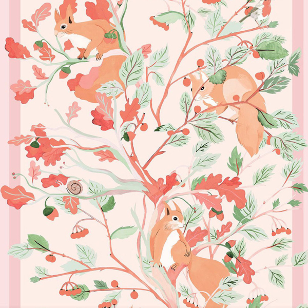Mischievous squirrels hidden in an interlacing of oak and hazel branches make up this motif designed by Little Cabari. This romantic and graceful wallpaper is punctuated by a vertical stripe.