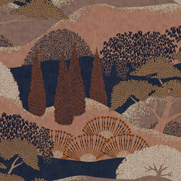 The Jardin Japonés wallpaper by Coordonné is a lush and immersive work of art that offers a sense of serenity. Contemporary plantations take the form of terraces with pointillist cypresses, creating a dynamic and distinguished landscape. The subdued, intense, and deep colors add a sophisticated touch to this masterpiece.